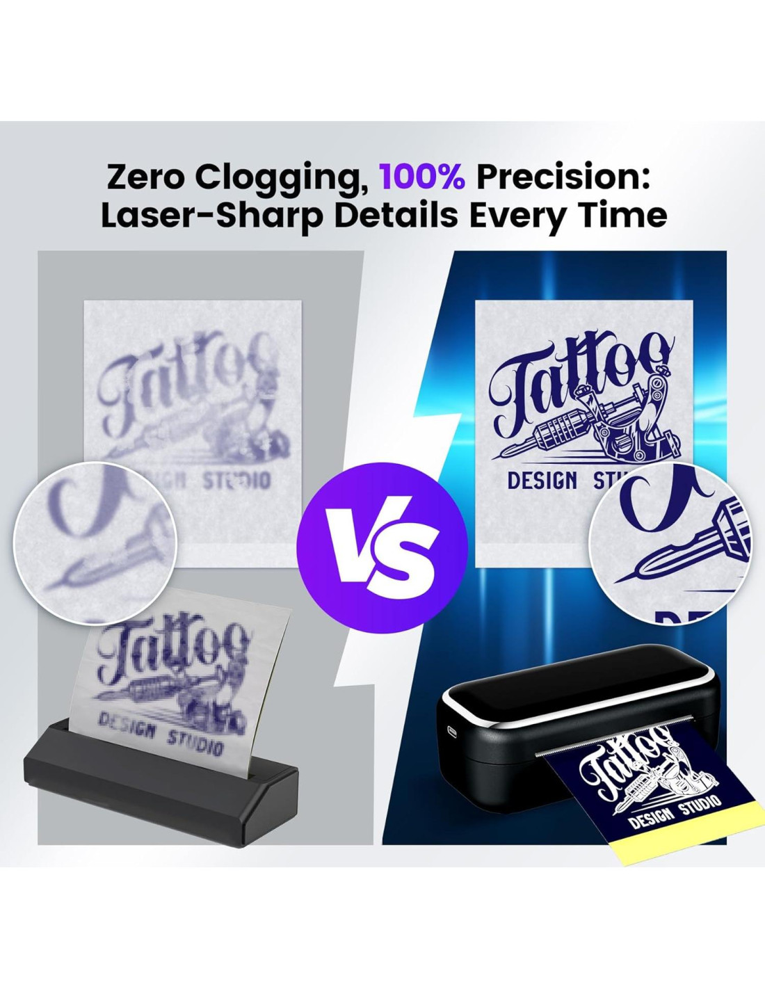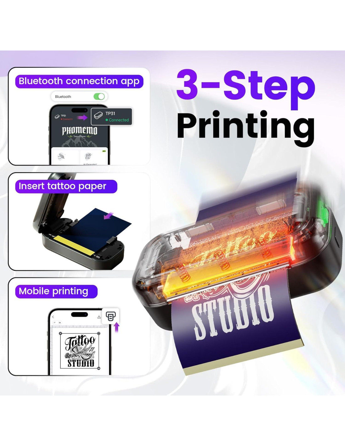 Nos esforzamos por ser la mano derecha de los entusiastas del tatuaje, abriendo posibilidades infinitas para tu arte. Desde líneas intrincadas hasta texturas delicadas, la Impresora de Tatuajes M08F puede llevar tus ideas creativas a diseños reales. Combinando tecnología tradicional y moderna, conectividad inalámbrica para teléfonos y conectividad por USB para computadoras, ¡deja que la impresora te lleve en un viaje de tatuajes únicos, fáciles y extraordinarios! Equipado con una batería recargable de 2200mAh que puede imprimir hasta 330 hojas por carga. Es una opción ideal tanto para artistas de tatuajes profesionales como para aficionados. Imprime patrones de tatuajes claros y precisos en 5 segundos. Libre de problemas de obstrucción, asegura resultados de impresión estables tanto para tatuajes permanentes como temporales, satisfaciendo todas tus necesidades de impresión de plantillas de tatuajes. 4 pasos, domina rápidamente su operación y da vida a tus ideas creativas. Sube tus patrones personalizados y crea tatuajes personalizados con facilidad. La impresora de transferencia de tatuajes TP31 con aplicación mejorada ofrece una función de impresión con un solo clic, junto con diseño de tatuajes AI, opciones de vista previa, una vasta biblioteca de materiales y funciones versátiles de edición de imágenes. Puedes subir tus patrones personalizados y crear tatuajes personalizados con facilidad.