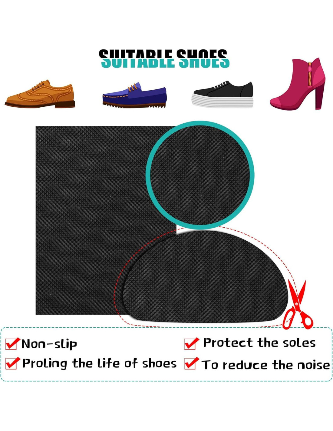 - Amplia gama de aplicaciones: puede ser en zapatos de cuero, zapatos de trabajo, botas, sandalias, tacones, zapatos de lona, zapatos casuales, etc. Pega la almohadilla antideslizante para zapatos; Proporciona protección a las suelas de tus zapatos mientras corres, escalas o haces senderismo, y camina en silencio en bibliotecas, oficinas, hospitales, reuniones, etc.