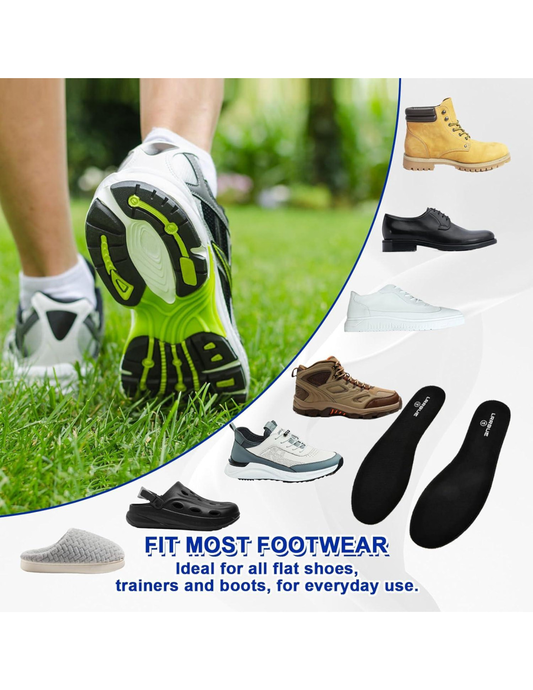 - Las plantillas de espuma viscoelástica LRRBUE te ayudan enormemente cuando trabajas o estás de pie todo el día, ya que la espuma viscoelástica absorbe la presión en tus piernas. Plantillas que absorben impactos para caminatas largas, senderismo o correr.