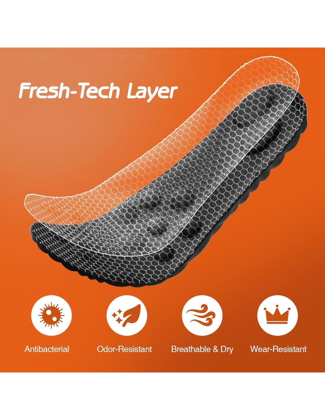- Frescura Transpirable Todo el Día: Nuestras plantillas están diseñadas con una estructura de panal transpirable y materiales de secado rápido fresh-tech, que promueven el flujo de aire y gestionan eficazmente la humedad para mantener tus pies secos, frescos y cómodos durante todo el día. Las propiedades avanzadas de frescura mejoran aún más la frescura, asegurando una experiencia limpia y agradable con cada paso que das.