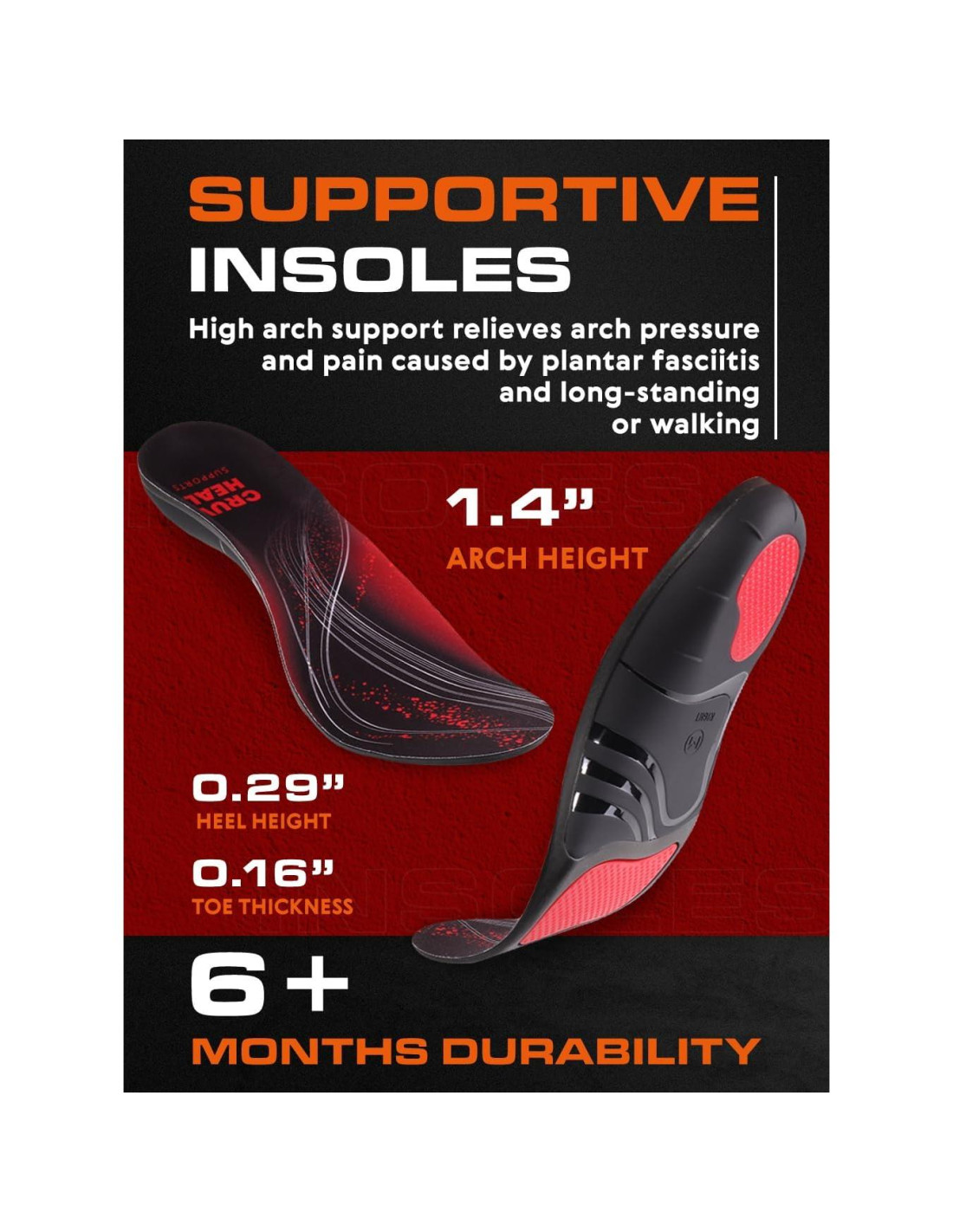 - Plantillas de soporte: las inserciones son ideales para personas de más de 220 libras (99.79 kg) y ofrecen un arco de 1.4 pulgadas (3.56 cm). Ayudan a equilibrar la distribución del peso corporal y reducen el impacto en los pies