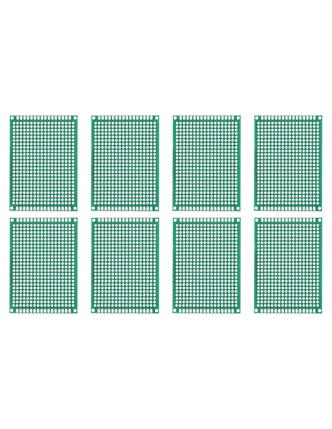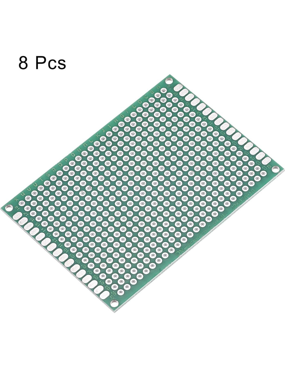 ¿Qué es esto? Esta placa PCB de fibra de vidrio de doble cara es una placa electrónica dispuesta de acuerdo con el espaciado estándar de IC (2.54mm). Diseñada para principiantes, para que los principiantes puedan probar y aprender. Estas placas PCB son excelentes para el ensamblaje de una placa electrónica de estilo punto a punto. Adecuadas para innumerables pequeños proyectos electrónicos como construir un robot. Si estás trabajando con electrónica de hobby y deseas una solución de circuito más permanente pero no quieres diseñar tu propia PCB, ¡estas son perfectas para ti! ¿Qué recibiré? Las placas de prototipado que proporcionamos aquí tienen el tamaño de: Dimensión: 50mm x 70mm (1.97 x 2.76 pulgadas); Grosor: 1.6mm (0.06 pulgadas); Diámetro del Agujero Estañado: 1mm (0.04 pulgadas); Separación del Agujero Estañado: 2.54mm (0.1 pulgadas) En el paquete de: 8 x Placas PCB Doble Cara ¿Hay alguna ventaja del producto? Hecho de fibra de vidrio FR-4, doble cara con agujeros pasantes estañados. Las placas son duraderas y los agujeros estañados pueden soportar calor sin despegarse. La capa verde en la superficie de la placa se utiliza para proteger el diagrama de circuito formado. ¿Cómo usarlo? Los agujeros pre-perforados en cada esquina son excelentes para construir con dos capas. En la competencia de diseño electrónico, el trabajo generalmente necesita completarse en unos pocos días. Nuestra placa PCB de fibra de vidrio de doble cara cumple totalmente con este requisito porque los componentes se pueden soldar libremente. ¿Qué debo tener en cuenta? Por favor, empaquétalo con papel de periódico para prevenir la oxidación del agujero de soldadura. Si el agujero de soldadura está oxidado y no se puede estañar bien, puedes limpiarlo con una goma de borrar.