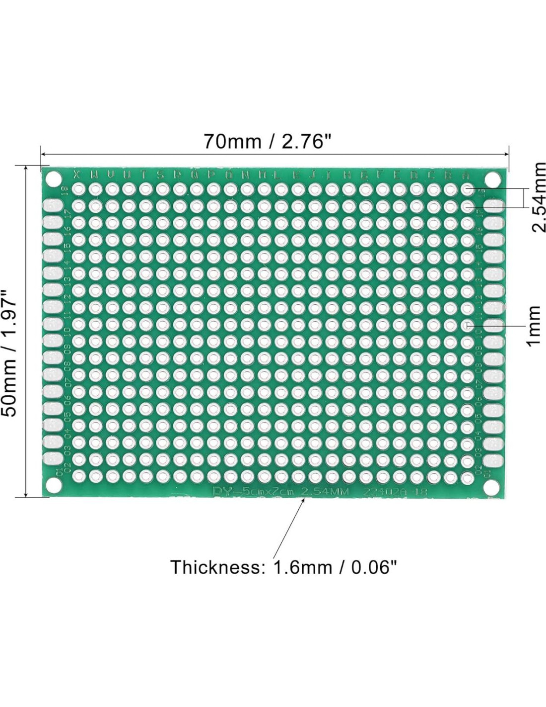 - Las placas de prototipado que proporcionamos aquí tienen el tamaño de: Dimensión: 50mm x 70mm (1.97 x 2.76 pulgadas); Grosor: 1.6mm (0.06 pulgadas); Diámetro del Agujero Estañado: 1mm (0.04 pulgadas); Separación del Agujero Estañado: 2.54mm (0.1 pulgadas)