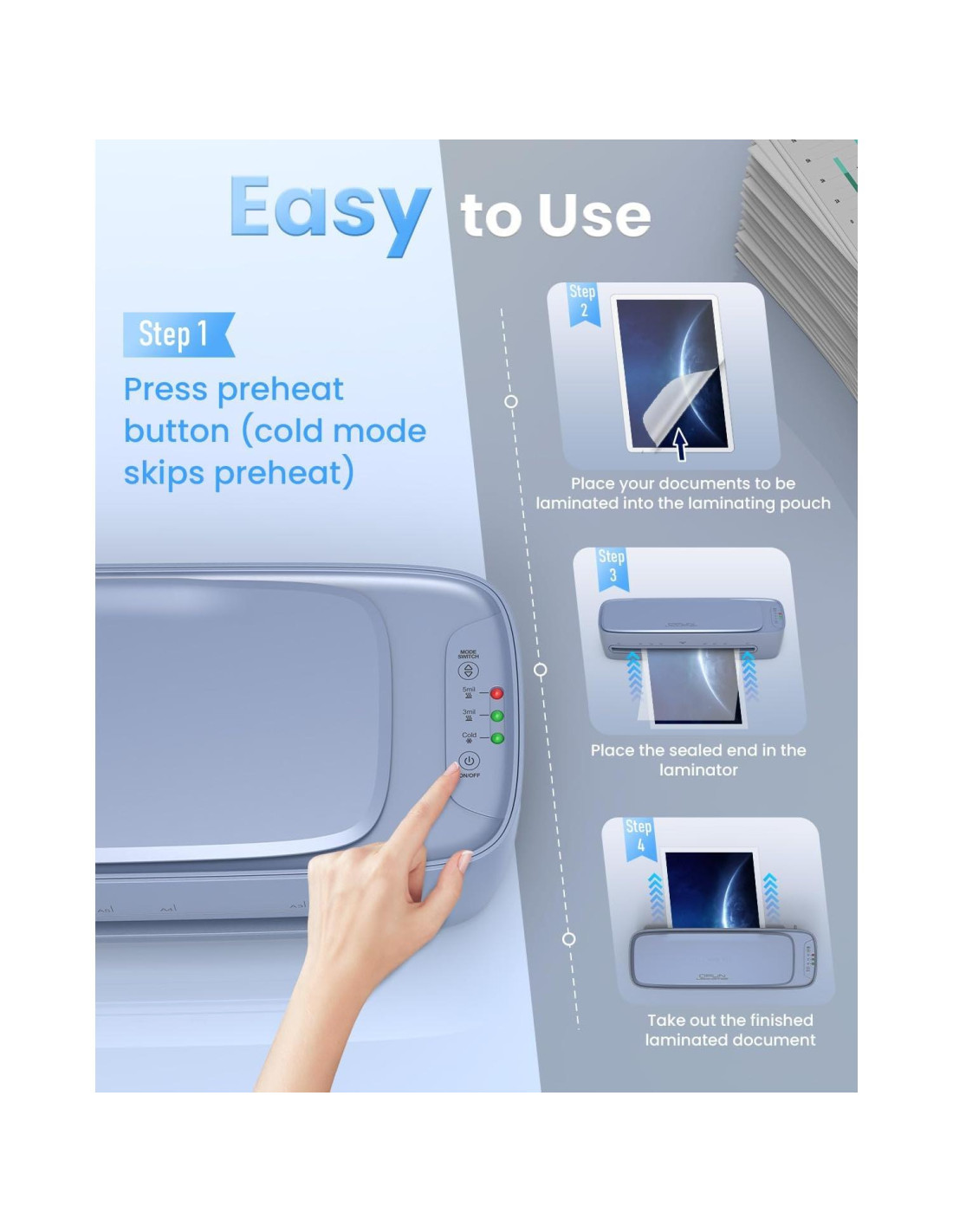 - Operación Simple en 4 Pasos: Enciende, Espera a que se caliente, Inserta el papel, ¡Listo! Sin configuraciones complicadas, incluso para usuarios primerizos. (Nota: la máquina de laminado con hojas de laminado puede tener un ligero olor durante el uso inicial, es normal, se desvanecerá después de algunas laminaciones.)