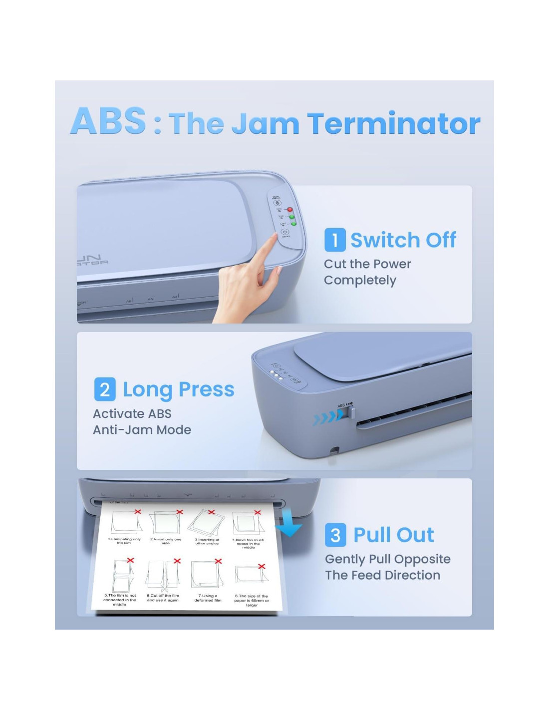- Botón de Liberación Rápida ABS: Presiona el botón ABS para quitar fácilmente materiales atascados. No más luchas, los artículos atascados salen suavemente como si tiraras de un pañ tissue, ahorrando tiempo y protegiendo tus documentos. Además, la función de apagado automático de 45 minutos asegura seguridad, eficiencia energética y prolonga la vida útil de la máquina de laminación.