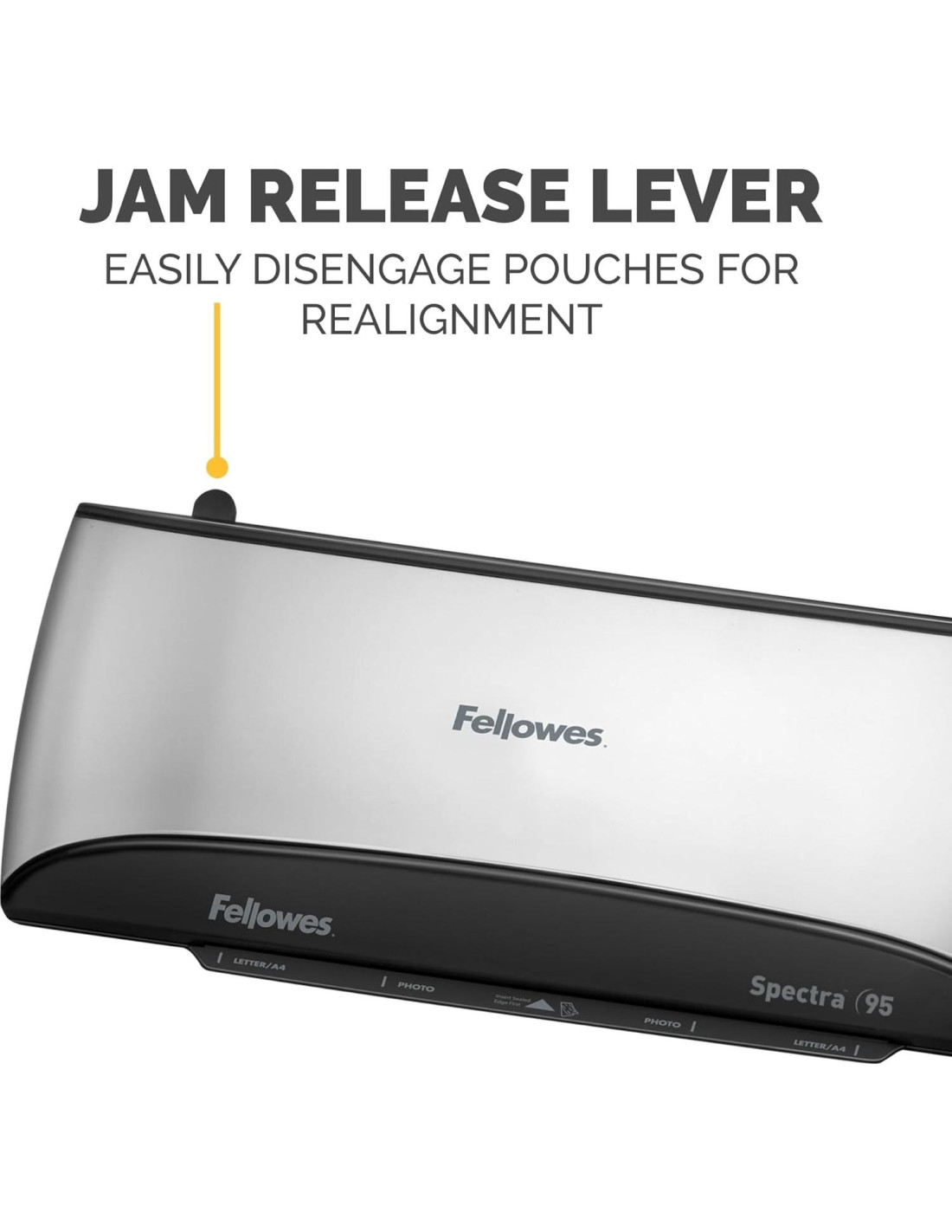 ¡Una gran máquina para laminar de manera rápida y fácil! La Laminadora Spectra 95 tiene un ancho de entrada de 24.1 cm para acomodar múltiples tamaños de documentos y puede laminar documentos y fotos de hasta 0.127 cm. Un modo de apagado automático asegura que esta laminadora sea eficiente en energía así como conveniente. Con un tiempo de calentamiento de 4 minutos y una palanca de liberación para re-centraje o remoción, esta máquina es ideal para tu hogar o oficina en casa.