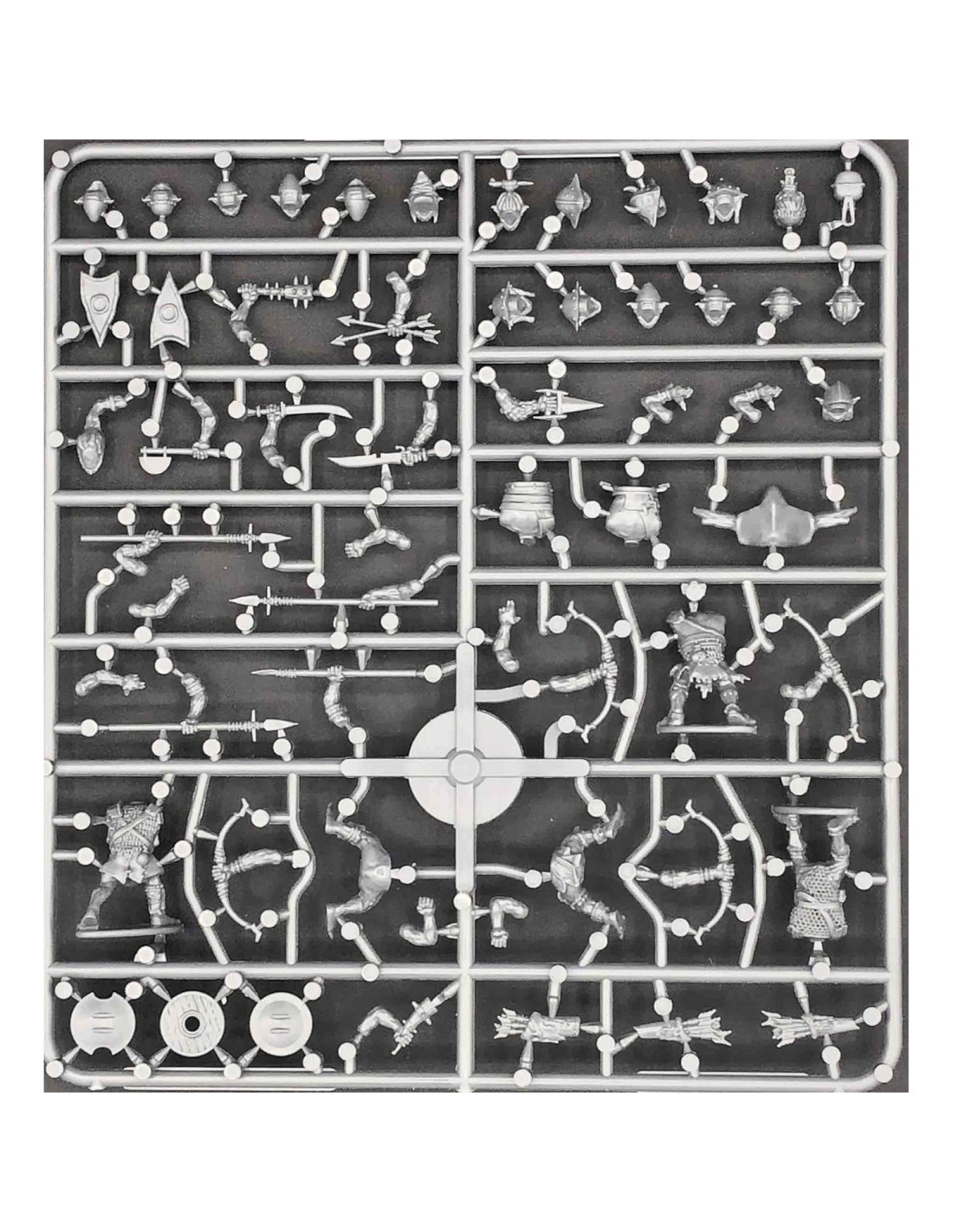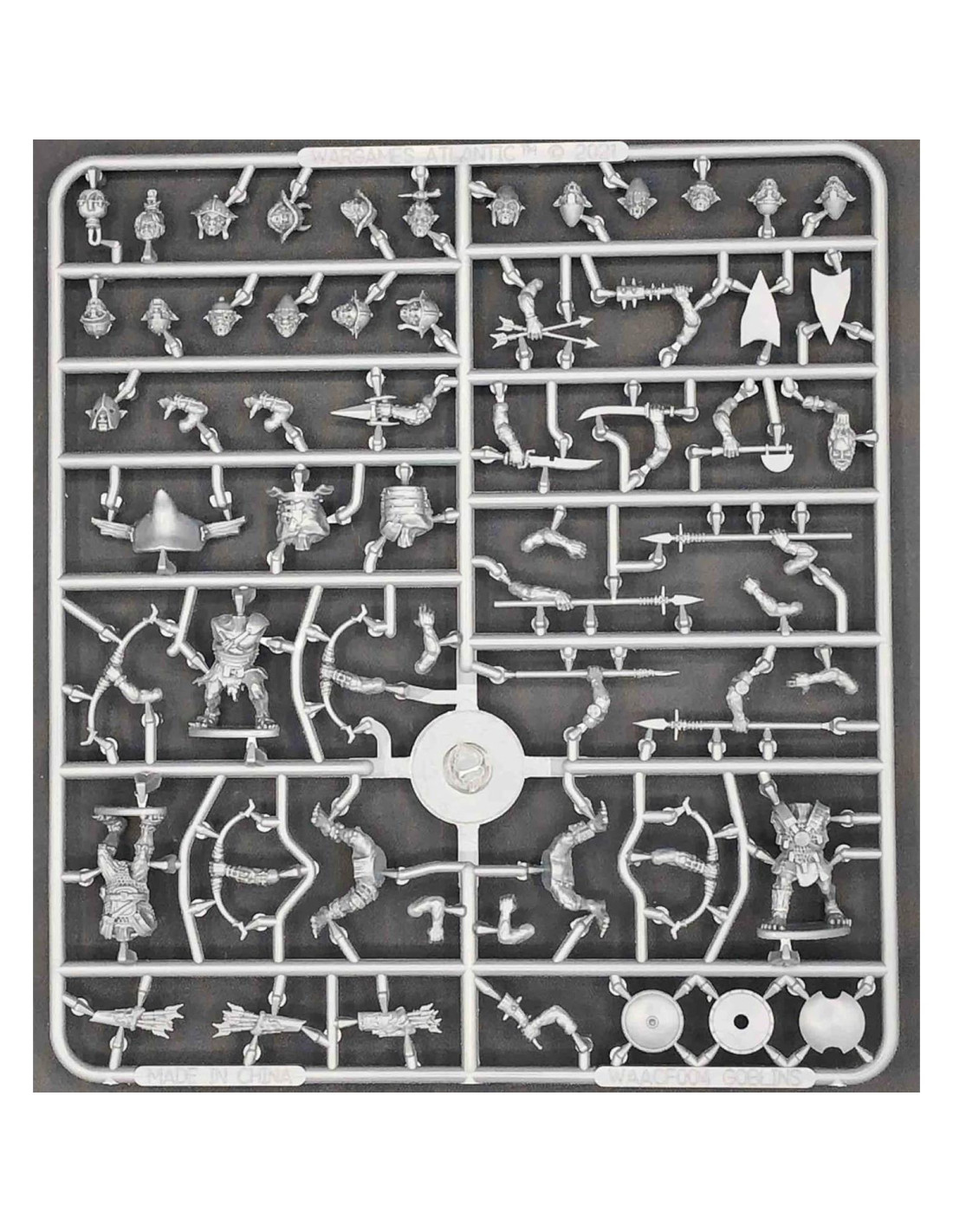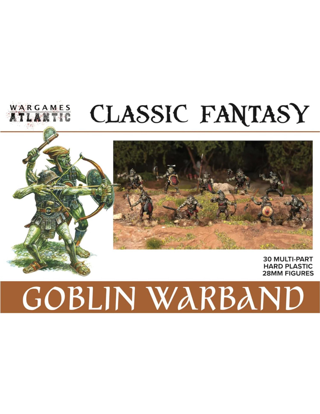 - Este conjunto de caja de plástico duro te permite desplegar hasta 30 guerreros Goblin con opciones para lanza, arco y una variedad de armas de mano desagradables.