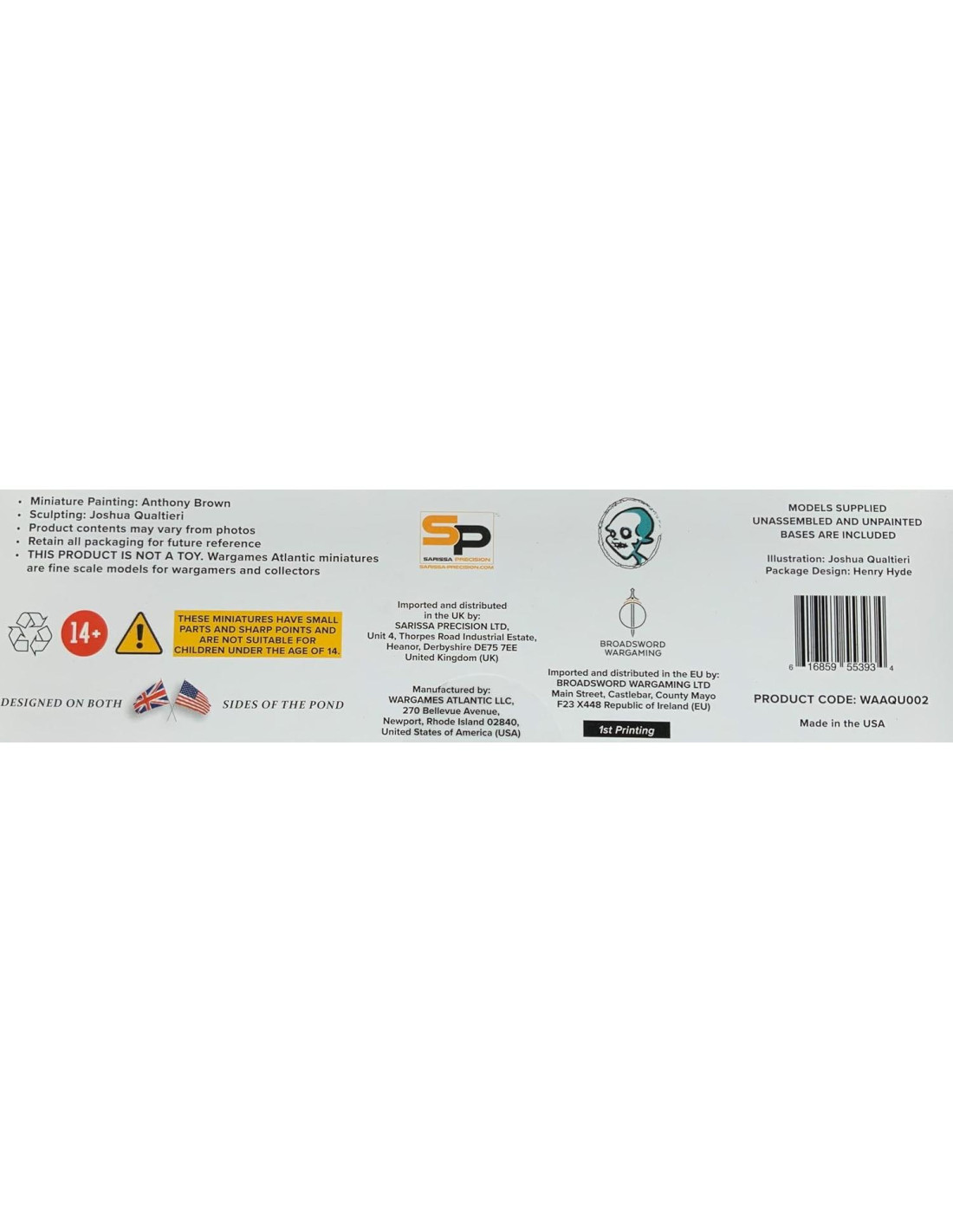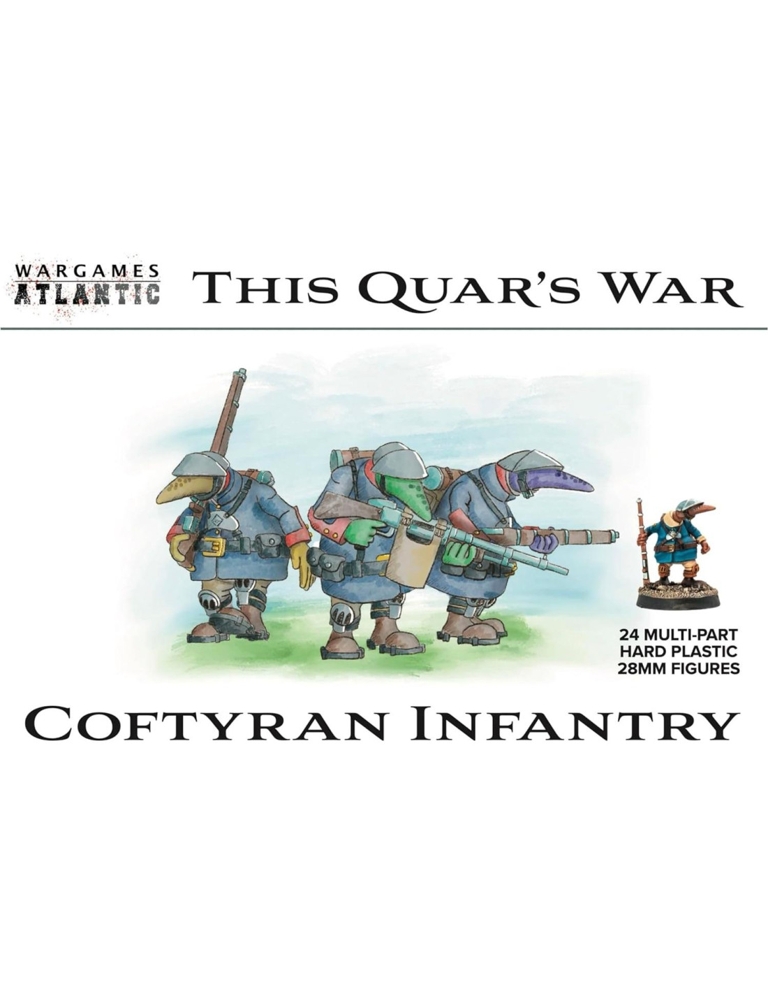 Wargames Atlantic Esta Guerra de Quar: Infantería Coftyran Aunque mucho más pequeña que el Ejército Cruzado, el Crymuster Coftyran nunca debe ser subestimado como fuerza de combate. Empapado en una rica tradición marcial y dedicado a preservar la sociedad tradicional Quar, el Crymuster está más que dispuesto a enfrentarse al coloso cruzado. Un rhyfler Coftyran puede sentirse orgulloso de la fabricación de sus armas, equipo y uniforme. Donde el uniforme cruzado es escaso, utilitario y producido en masa, el uniforme Coftyran evoca un período anterior. Las pieles a menudo son cosidas a mano, y la placa esternal de la mochila muestra con orgullo su unidad. Estos no son meros anacronismos pintorescos; Coftyr se ve a sí mismo como el último bastión de la civilización tradicional, y esta calidad y detalle sirven para recordar a los Rhyflers del Crymuster los lazos sociales de los Quar. Este conjunto de caja de plástico duro incluye suficientes piezas para construir 24 Coftyrans con opciones para el Rifle Largo Harlech, el LMG Cryfen y el SMG Doru con una variedad de cabezas y piezas extra y 24 Bases de 25mm de Uso Dual de Wargames Atlantic. Número de Parte del Producto: WAAQU002