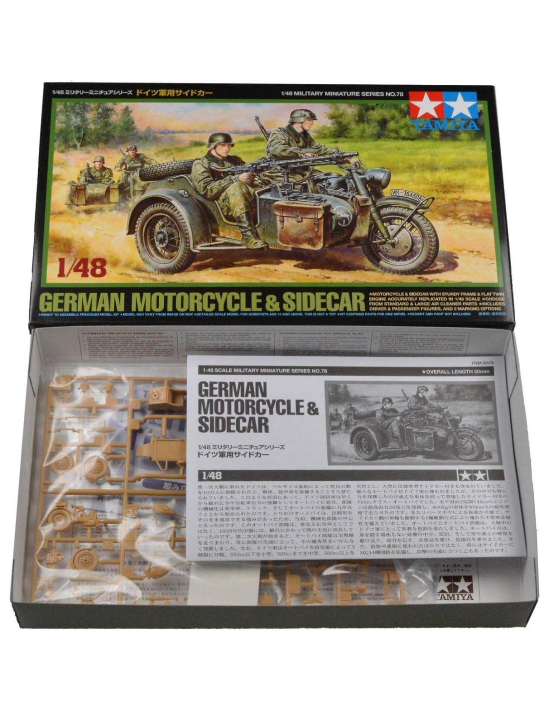 Motocicleta construida por BMW en tiempos de guerra en servicio de la Wehrmacht. Los sidecars fueron emparejados con motocicletas por las fuerzas alemanas en muchas áreas del conflicto de la Segunda Guerra Mundial y su excelente capacidad todoterreno combinada con la potencia del motor de la moto los convirtió en un activo útil para transportar soldados y equipo, algunos incluso estaban montados con ametralladoras. El kit tiene un marco y motor detallados con delicadas ruedas de radios, contiene figura de piloto y pasajero del sidecar - cada uno con armas y equipo separados. Calcomanías y referencia de pintura para 2 motocicletas: 24 División Panzer, Frente Oriental 1942 y 5 Regimiento de Paracaidistas, Túnez 1943 - incluye indicador de velocidad, números de registro.