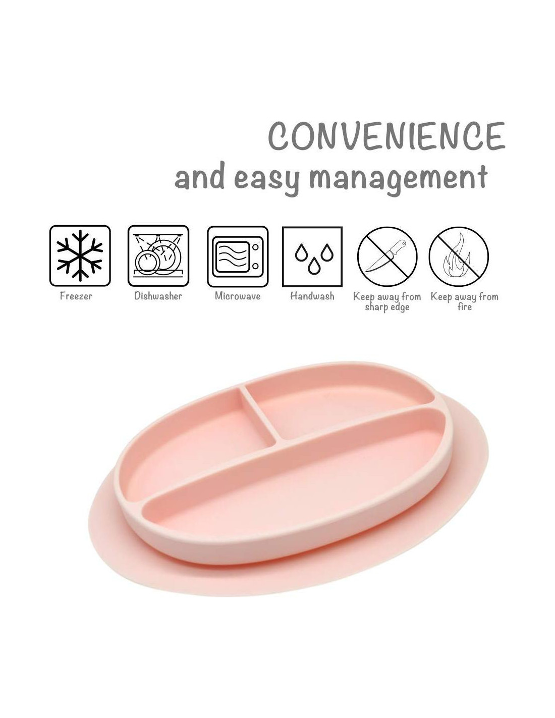- Secciones Divididas Grandes: Nuestro plato para niños pequeños cuenta con tres secciones, facilitando la disposición de la comida principal y guarniciones de tu pequeño.