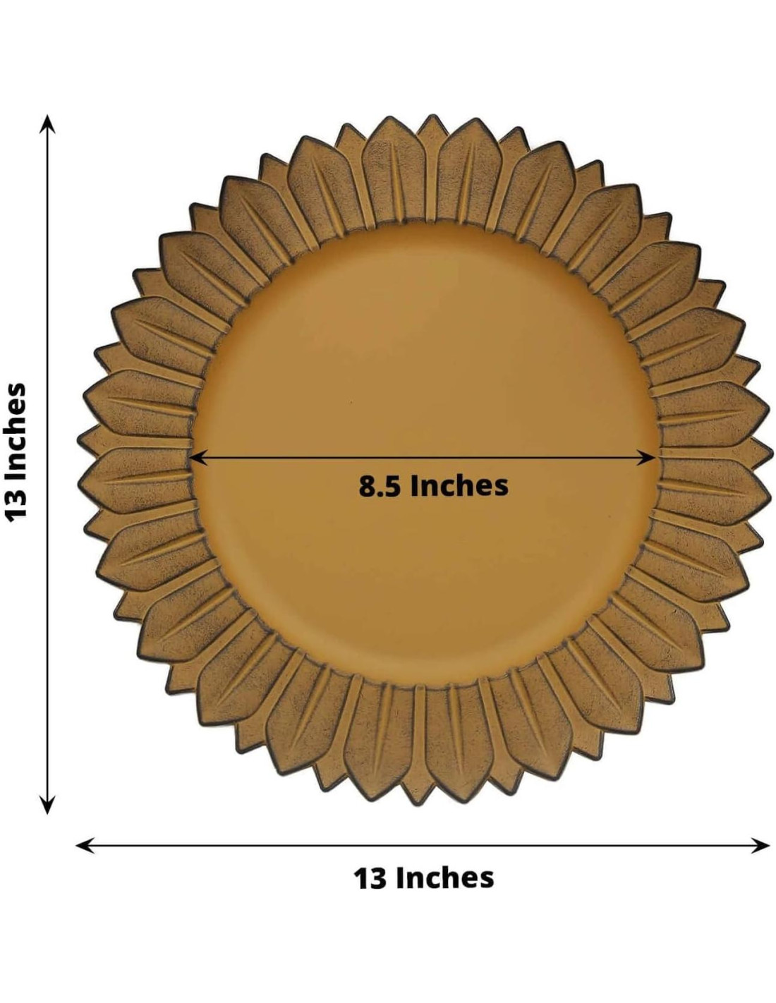 - Cantidad: 6 Platos Cargadores Material: Plástico Duro Color: Amarillo Mostaza Estilo: Diseño de Girasol Diámetro del Plato: 31.75 cm Diámetro Interior: 21.59 cm Profundidad: 0.64 cm Forma: Redonda