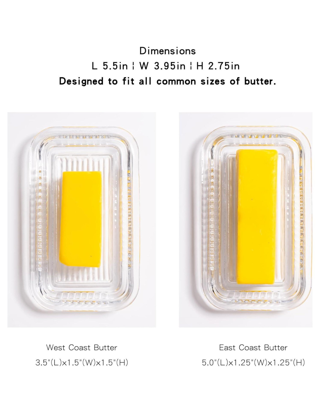 - Gran Capacidad - Tamaño: 14 cm L x 10 cm W x 7 cm H (5.5"L x 3.95"W x 2.75"H), nuestro plato de mantequilla de vidrio con tapa puede contener fácilmente dos barras de mantequilla, está diseñado para adaptarse a todos los tamaños comunes de mantequilla de las costas este y oeste. También es reversible: puedes tener el lado espacioso hacia arriba o hacia abajo