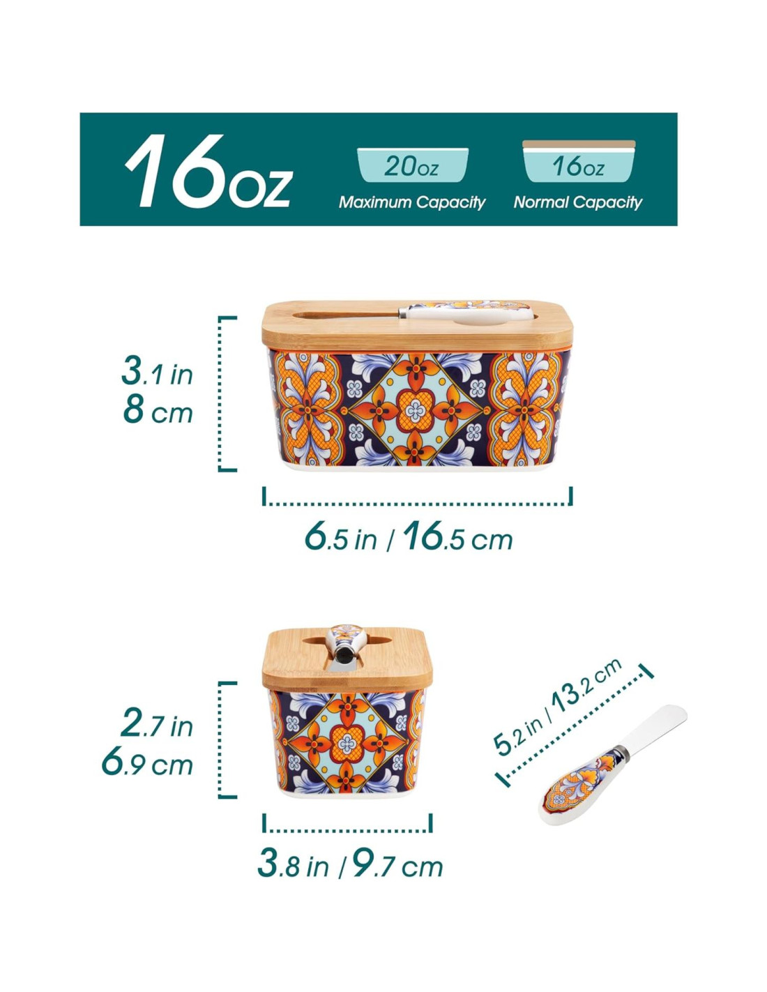 - [Se Adapta a la Mayoría de Tamaños de Mantequilla y Perfecto para Regalar] Midiendo 6.5" (16.5 cm) L x 3.8" (9.7 cm) W x 3" (7.6 cm) H, este plato de mantequilla con tapa se adapta cómodamente a los palitos de mantequilla de tamaño estándar y acomoda varios tipos de mantequilla. Ideal para uso diario en cualquier cocina, también es un regalo considerado para inauguraciones de casas, bodas, festividades y más. Disponible en una variedad de patrones únicos para complementar cualquier decoración.