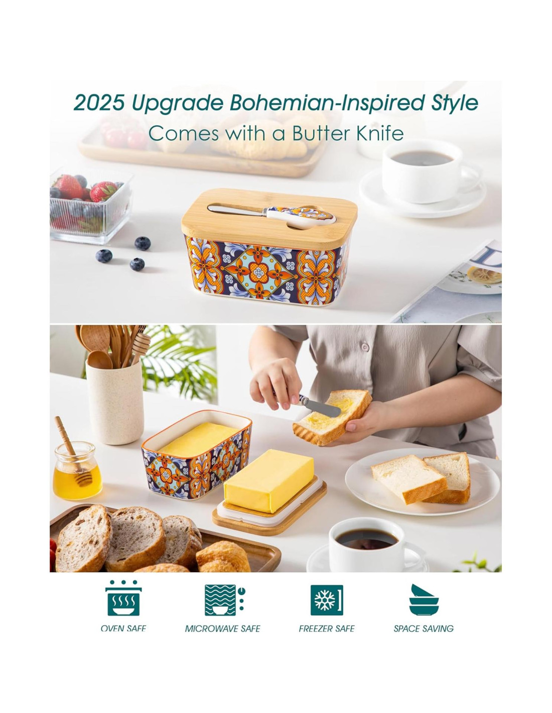 - [Diseños Vibrantes y Coloridos] El plato de mantequilla con tapa de estilo bohemio de vancasso cuenta con diseños encantadores e intrincados que capturan la esencia libre y espiritual de la cultura bohemia. Los colores vivos y los patrones artísticos evocan una sensación de alegría y positividad, mejorando tu experiencia gastronómica con una explosión de energía y felicidad.