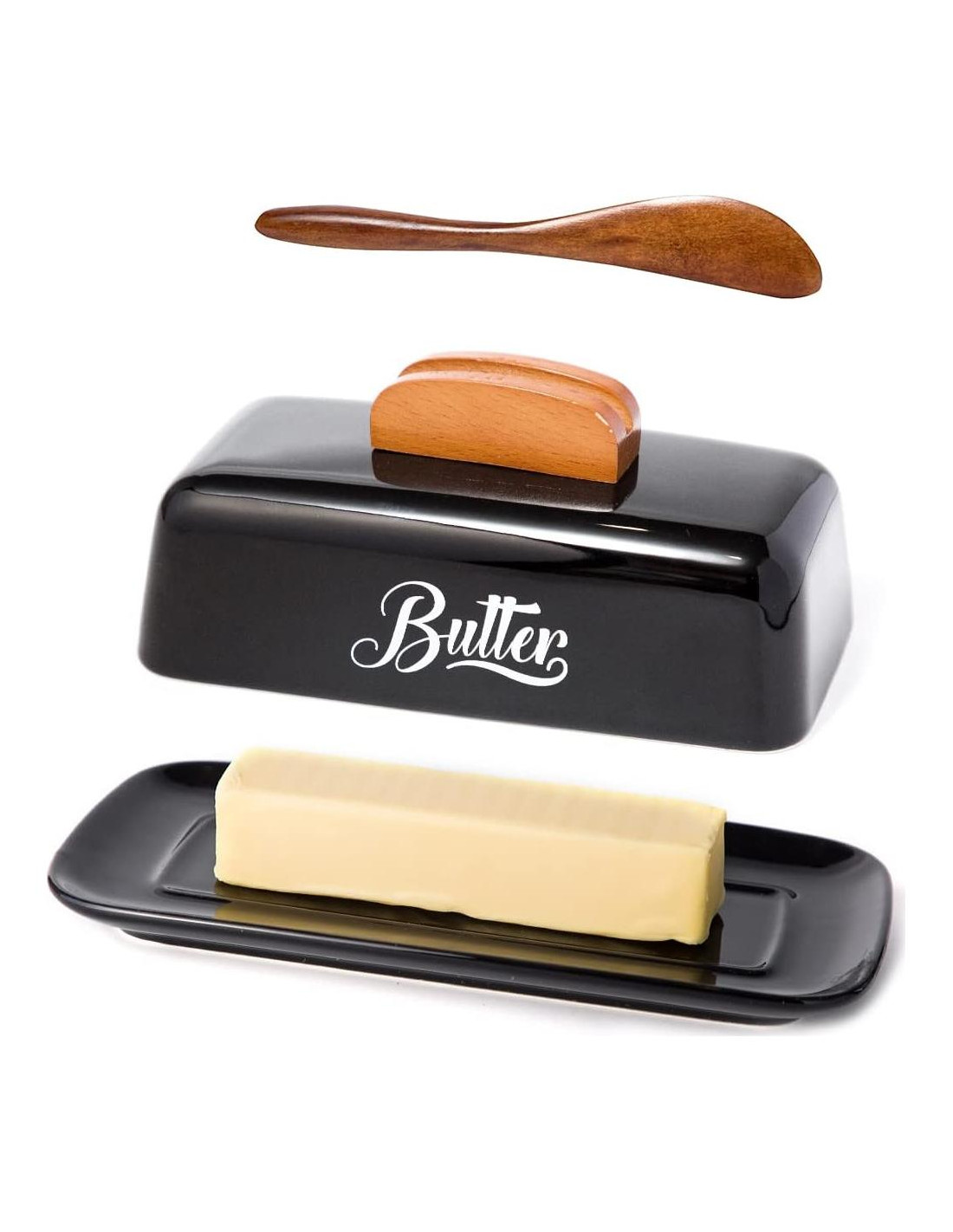 - [PLATO DE MANTEQUILLA CON TAPA Y CUCHILLO] : El conjunto incluye una tapa con un mango y un cuchillo de mantequilla. La tapa encaja perfectamente en la base, manteniendo la mantequilla perfectamente sellada, conservando su frescura por más tiempo. También puedes usar nuestro cuchillo de mantequilla incluido para cortar mantequilla o untar, facilitando mucho tu vida.