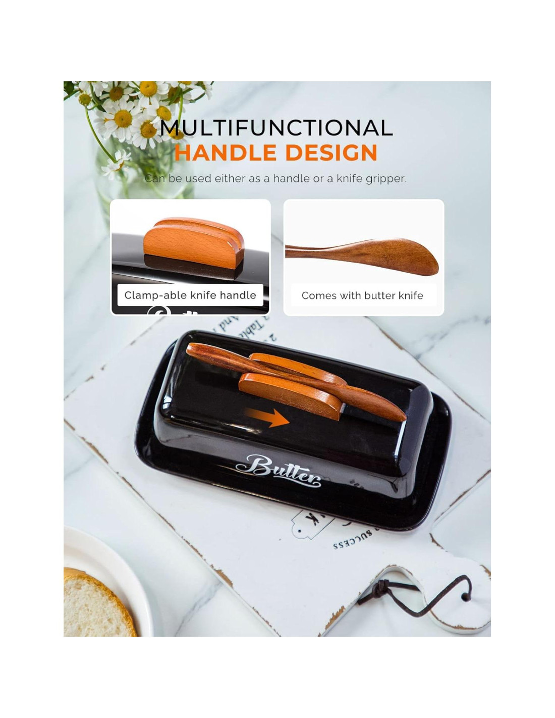 - [DISEÑO INNOVADOR - CLIP PARA CUCHILLO] : En comparación con los platos de mantequilla tradicionales, hemos innovado nuestro mango, que tiene un clip para sostener firmemente el cuchillo de mantequilla incluido. Ya no tienes que perder tiempo buscando un cuchillo y siempre hay un lugar conveniente para ponerlo después de usar.