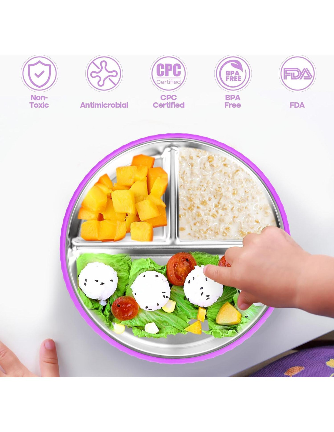 - Platos para Bebés con Succión: Platos de acero inoxidable para niños con 4 fuertes ventosas de silicona que mantienen el agarre en mesas/sillas altas-¡cero derrames durante la alimentación autónoma desordenada de los niños pequeños! Perfecto para guarderías, bandejas de sillas altas o viajes - ahorra horas fregando bandejas desordenadas