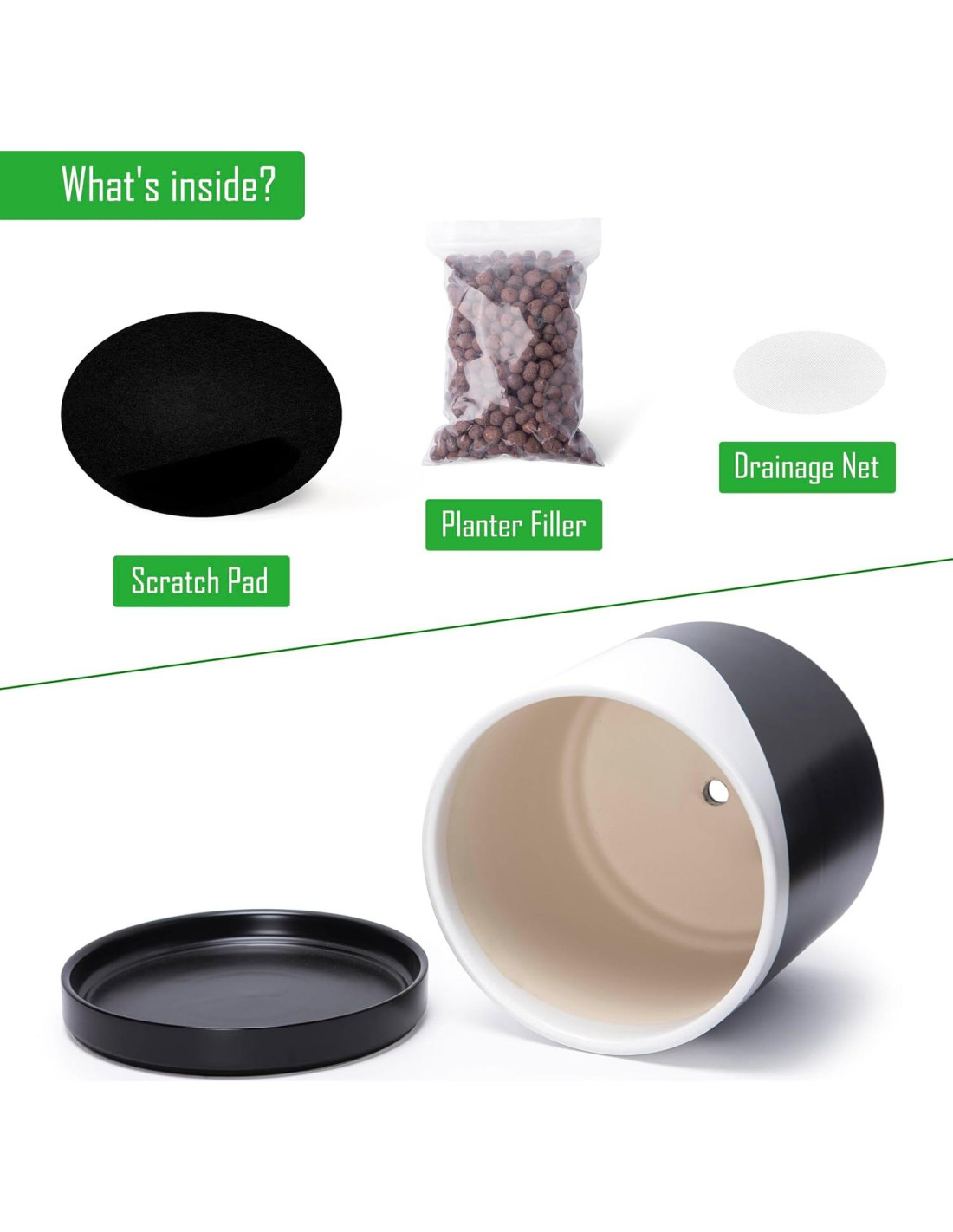 - Funcionalidad Reflexiva: Incluye un orificio de drenaje para prevenir el exceso de riego, además de una red de drenaje de malla y una almohadilla para rasguños para mayor comodidad.