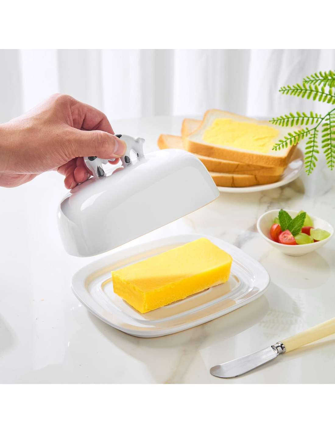 - [Diseño Adorable de Asa de Vaca] Añade encanto a tu cocina con nuestra bandeja blanca para mantequilla que presenta una linda asa de vaca. Este toque único y juguetón la convierte en un tema de conversación en la mesa de desayuno mientras ofrece un agarre resistente para una fácil extracción de la tapa.