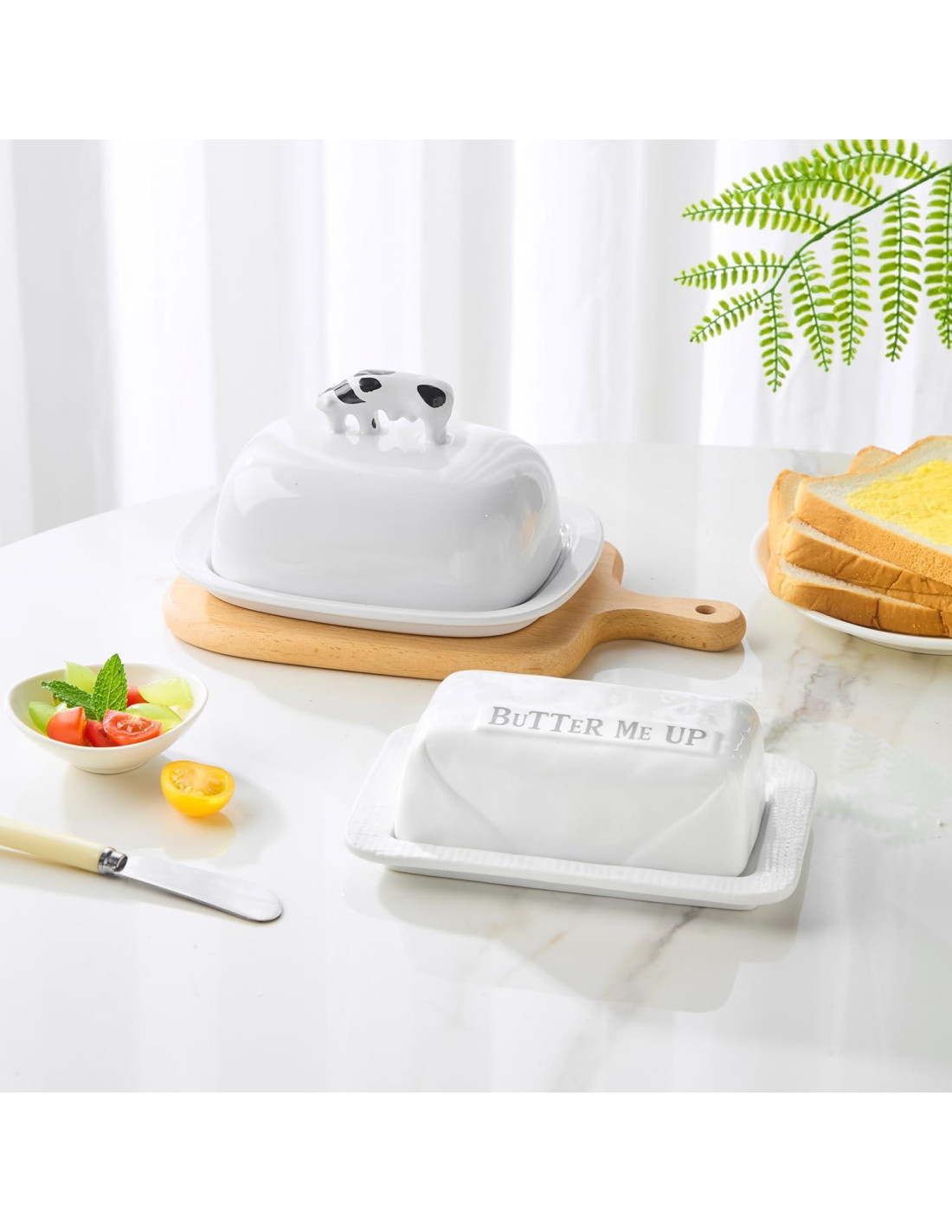 - [Decoración de Cocina Elegante y Funcional] Mantén la mantequilla suave, untar y lista para usar con nuestro divertido plato para mantequilla con tapa para almacenamiento en la encimera. Este ahorrador de mantequilla combina estilo y utilidad, complementando cualquier decoración de cocina. Ya sea que estés organizando un brunch o preparando la mesa para la cena, aporta un toque de encanto de granja y belleza práctica a tu encimera.