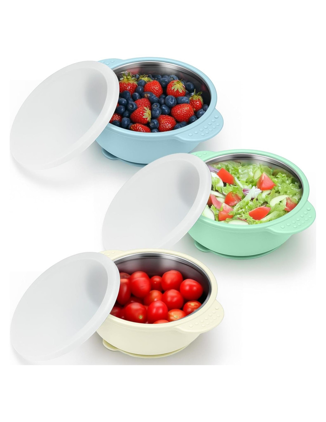 BUSOHA 3 Pack Cuencos de Acero Inoxidable para Bebés con Tapa - Platos de Alimentación 2 en 1 para Niños Resistentes al Calor y a Prueba de Derrames con Succión
