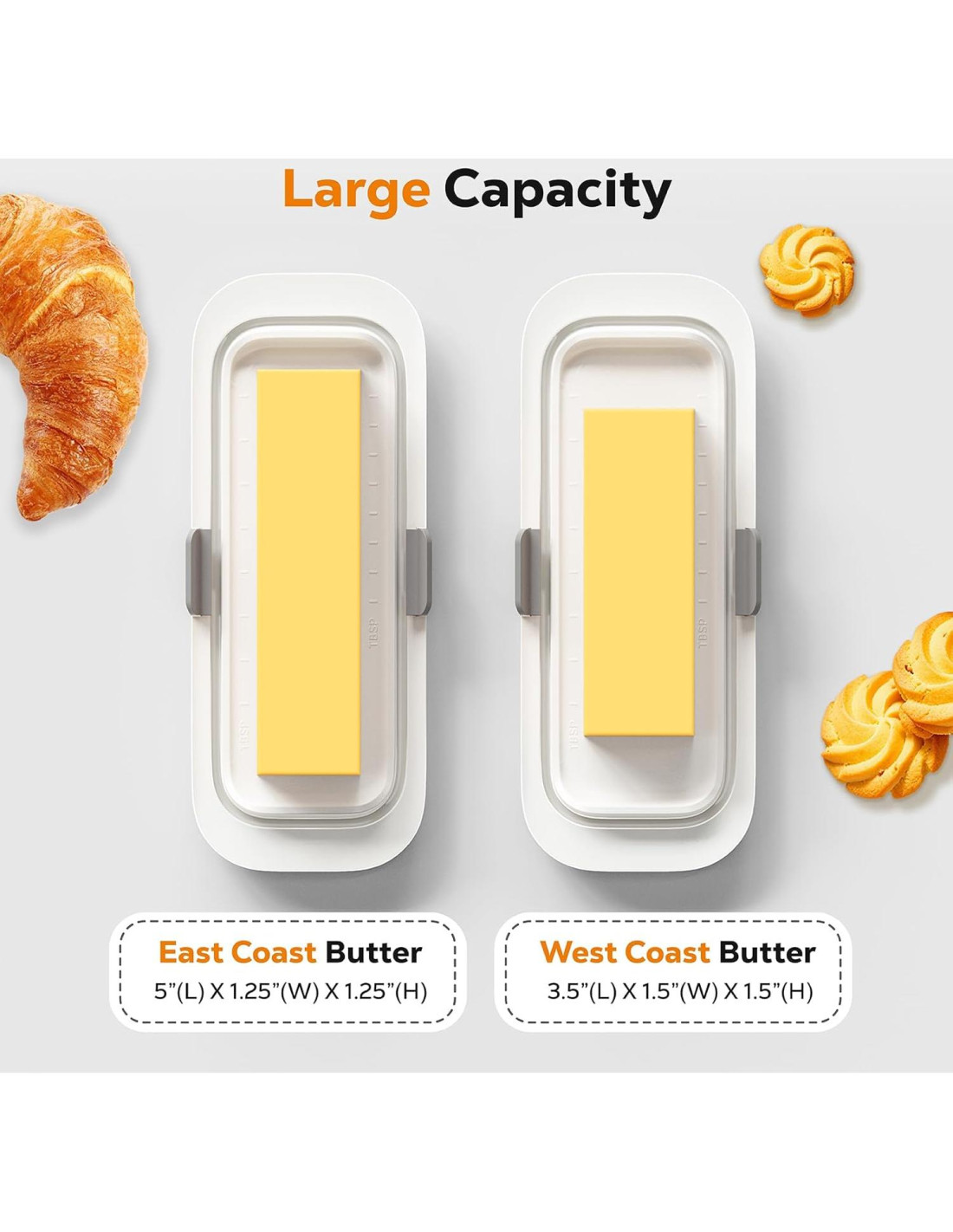 - Marcas de Medición: Las líneas de escala en el plato de mantequilla te ayudan a controlar tu ingesta de calorías y medir la cantidad deseada de mantequilla