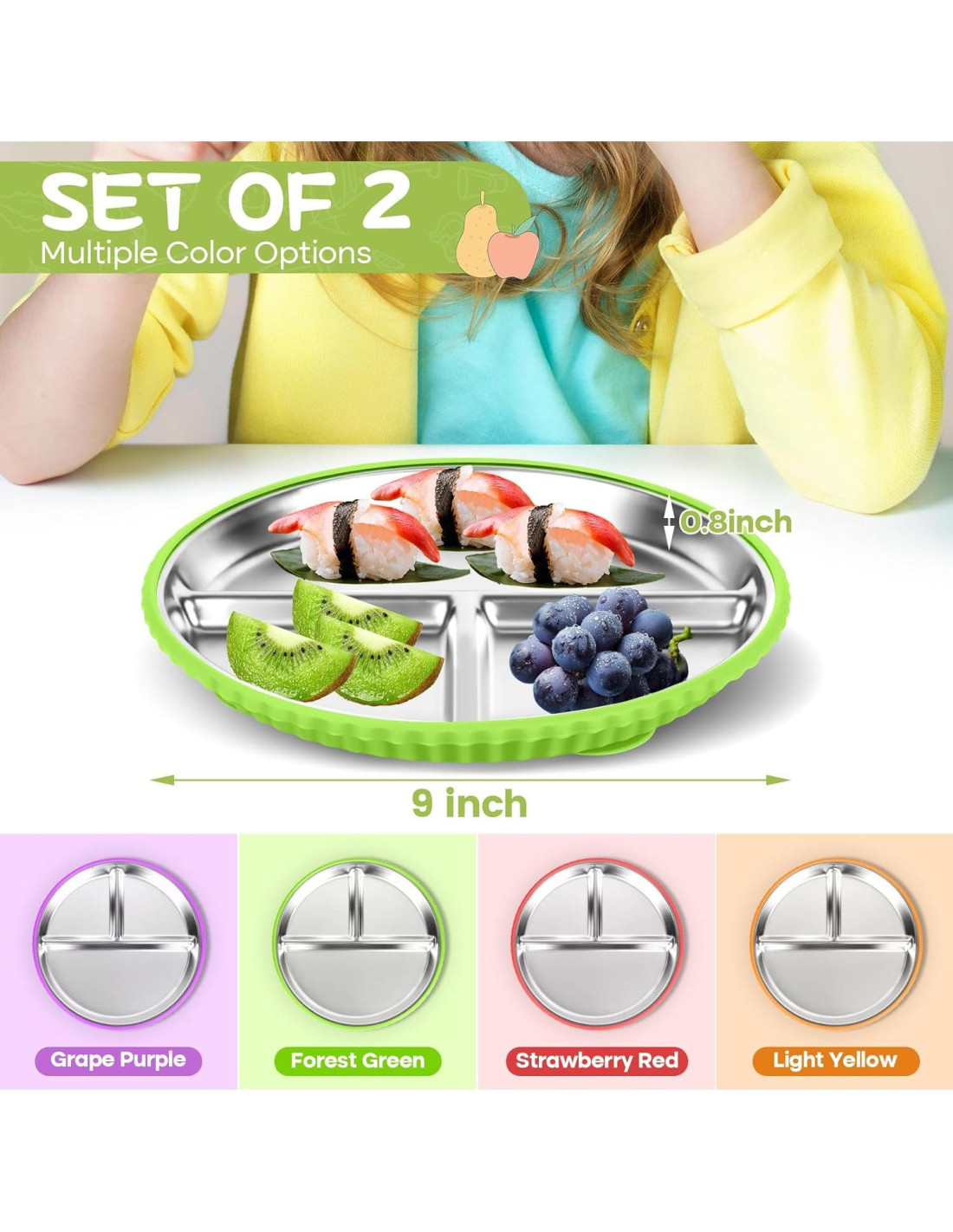 - Platos para Bebés con Succión: Platos de acero inoxidable para niños con 4 fuertes ventosas de silicona que mantienen el agarre en mesas/sillas altas-¡cero derrames durante la alimentación autónoma desordenada de los niños pequeños! Perfecto para guarderías, bandejas de sillas altas o viajes - ahorra horas fregando bandejas desordenadas