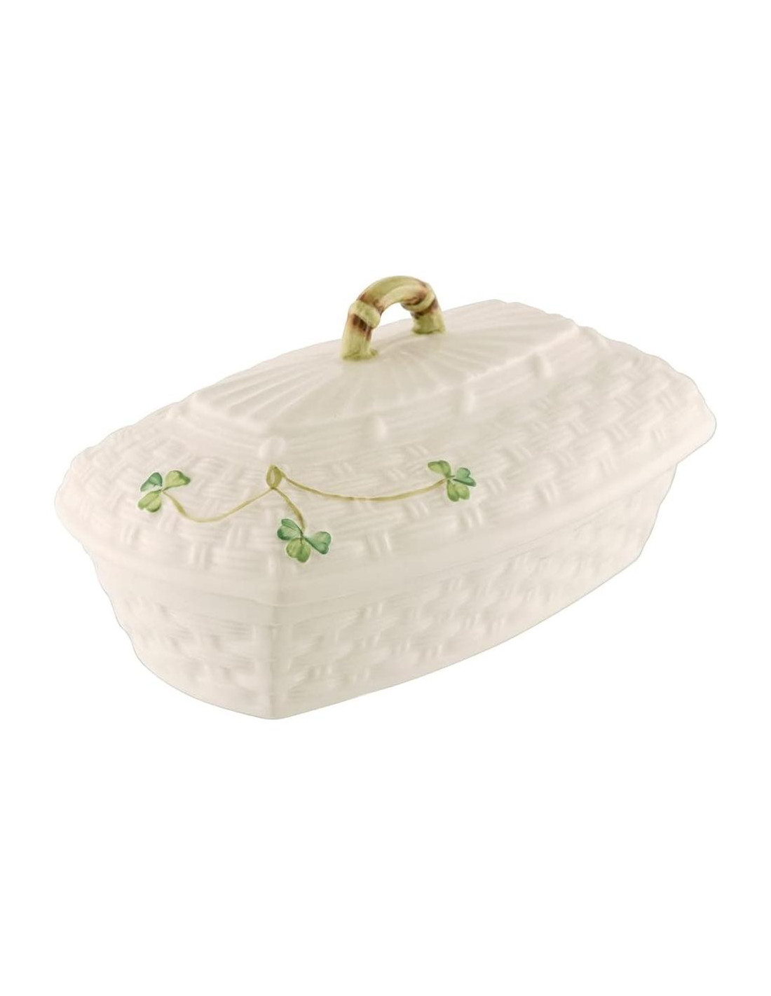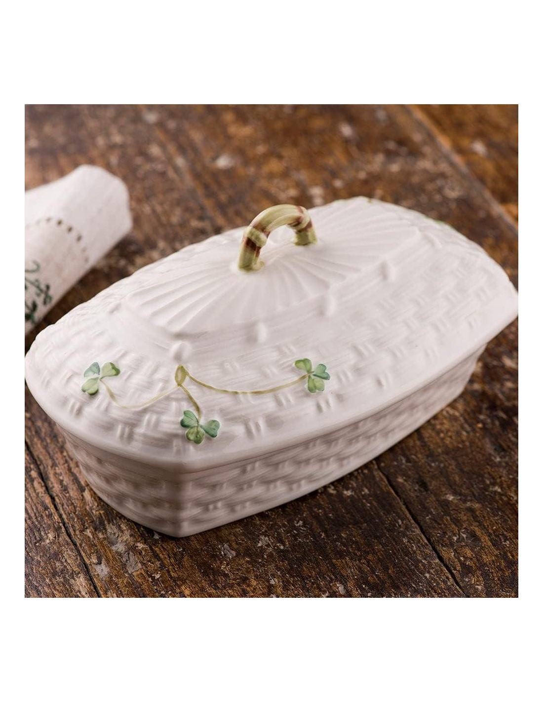 - ESENCIAL ATEMPORAL DE COCINA: Agrega un encanto clásico a tu cocina con este recipiente de mantequilla de cerámica, que presenta el tejido de canasta y tréboles característicos de Belleek. Es un contenedor de mantequilla que mide 3.9" x 3.9" x 7" (9.9cm x 9.9cm x 17.8cm), perfecto para tus necesidades de almacenamiento.