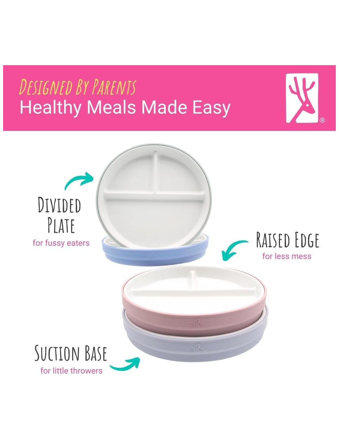 Platos Divididos de Porcelana Elk y Amigos para Niños de 6.7" con Mangas de Succión de Silicona | Adecuado para Bebés/Niños/Niños Pequeños | Apto para Microondas y Lavavajillas | Antideslizante | Platos para Snacks