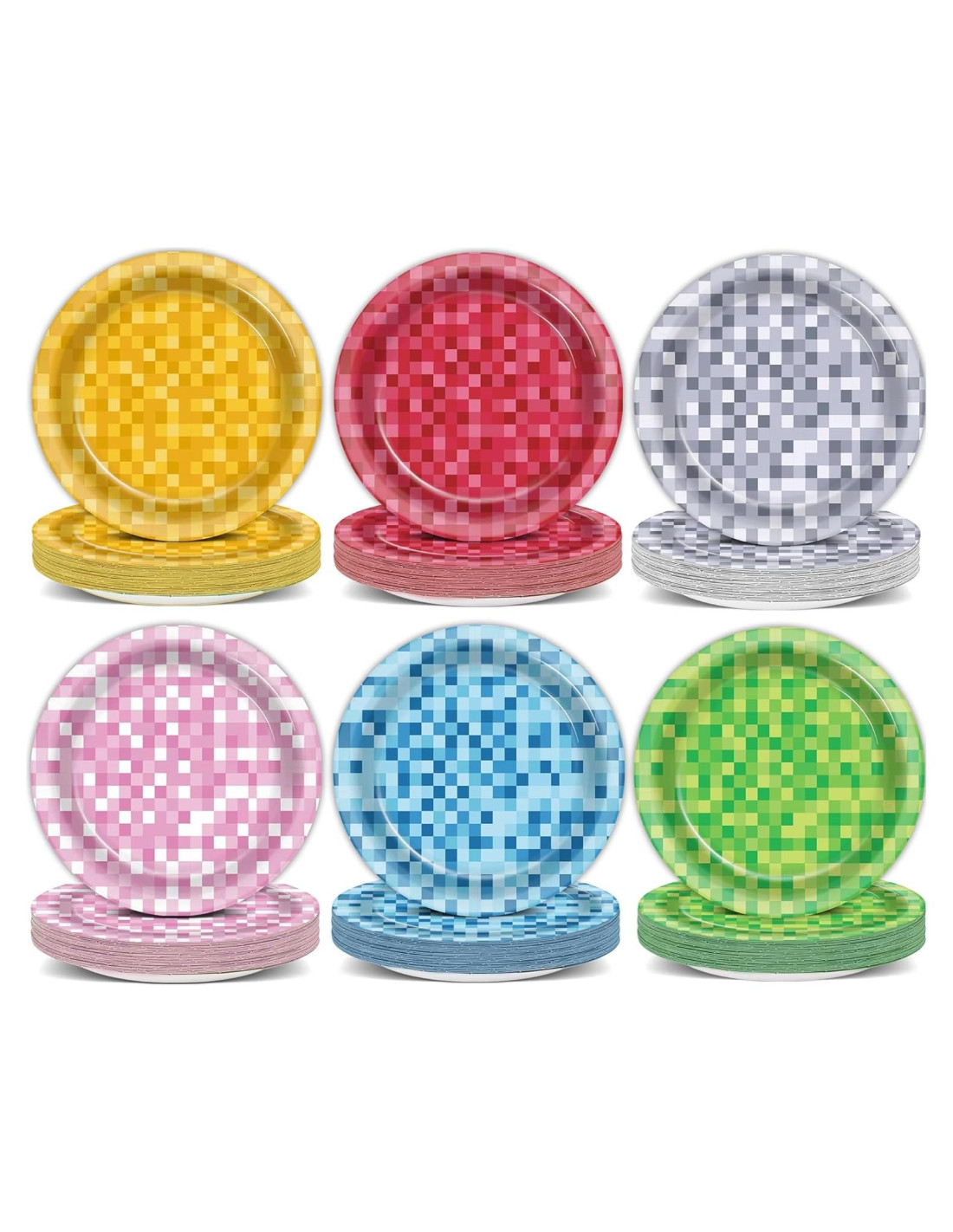 - Diseño pixel: Nuestros 60 platos de fiesta de cumpleaños pixel vienen en 6 colores vibrantes: verde, amarillo, rojo, rosa, gris y azul. Ideales para decoraciones de fiesta de cumpleaños temáticas pixel, dan vida a la estética de estos platos de fiesta pixel, haciendo que cada evento sea memorable.