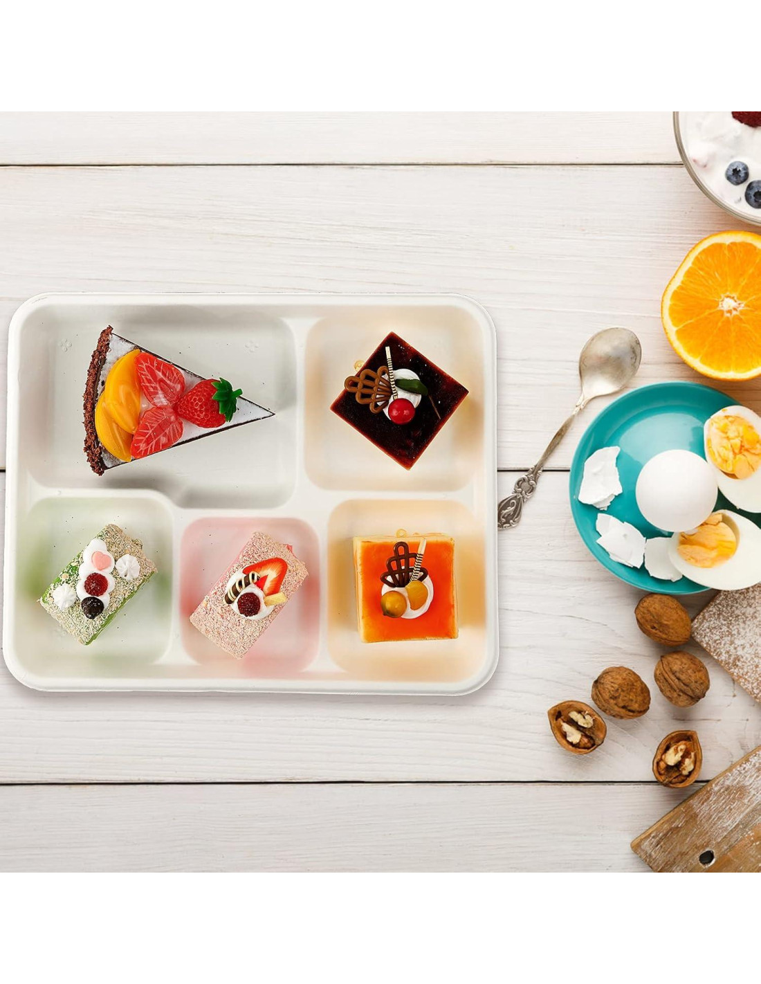 - Bandejas de 5 Compartimentos: Sirva Comidas en un Estilo Conveniente Bandejas de Comida Compostables. Proporcionando cinco Compartimentos Separados, la Bandeja mantiene la Comida Separada, Perfecta para un Plato Principal, Tres Guarniciones y un Postre