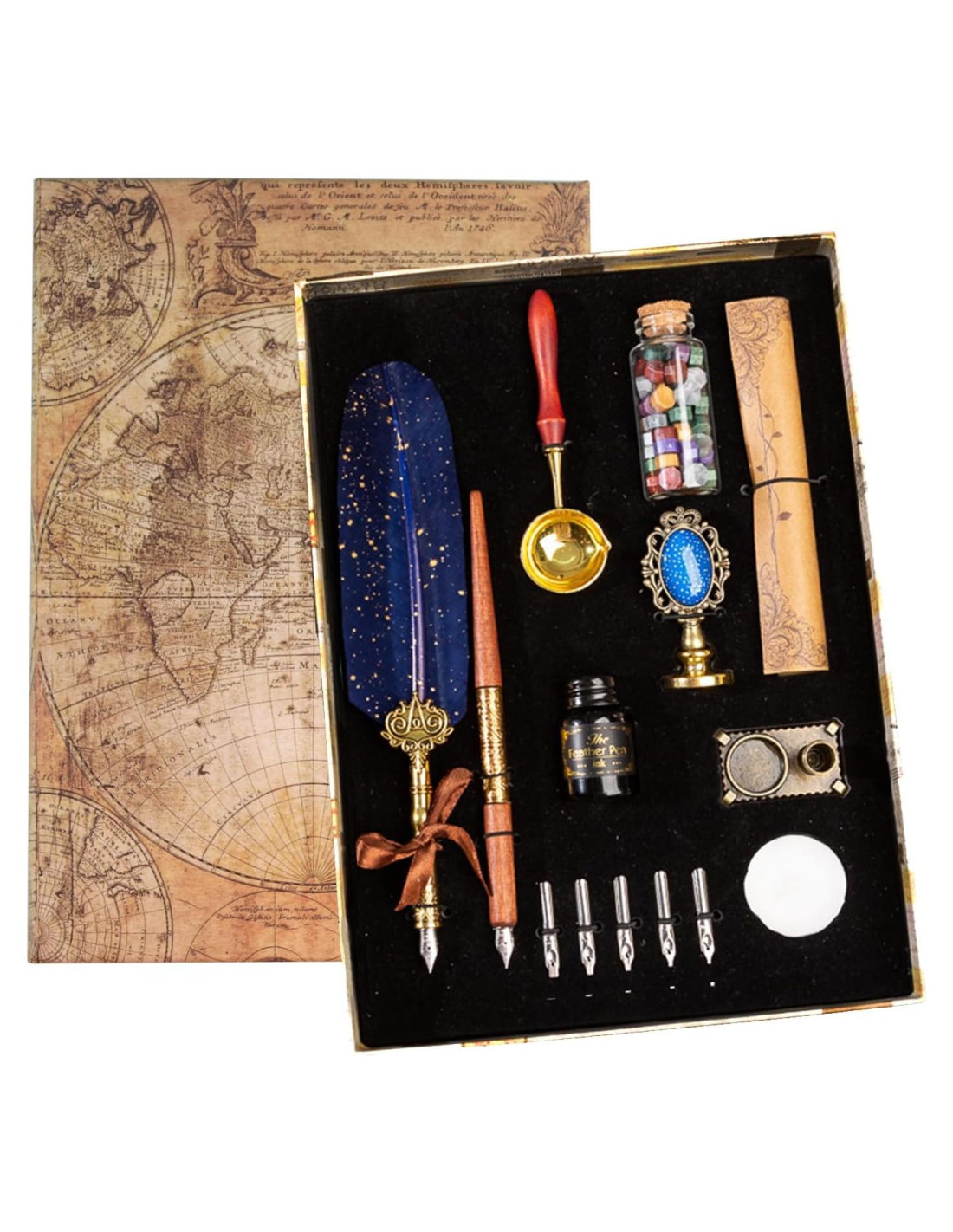 - Juego de Pluma de Caligrafía de Inmersión con Caja de Regalo - El juego de pluma y tinta vintage Joyeee incluye pluma de madera, botella de tinta negra de 15 ml, bases de soporte de pluma, perlas de cera de sellado, vela, cuchara de sello de cera, papel de oficina vintage y sobres, exquisita caja de regalo retro, tamaño 29x21x4 cm (L*W*H).