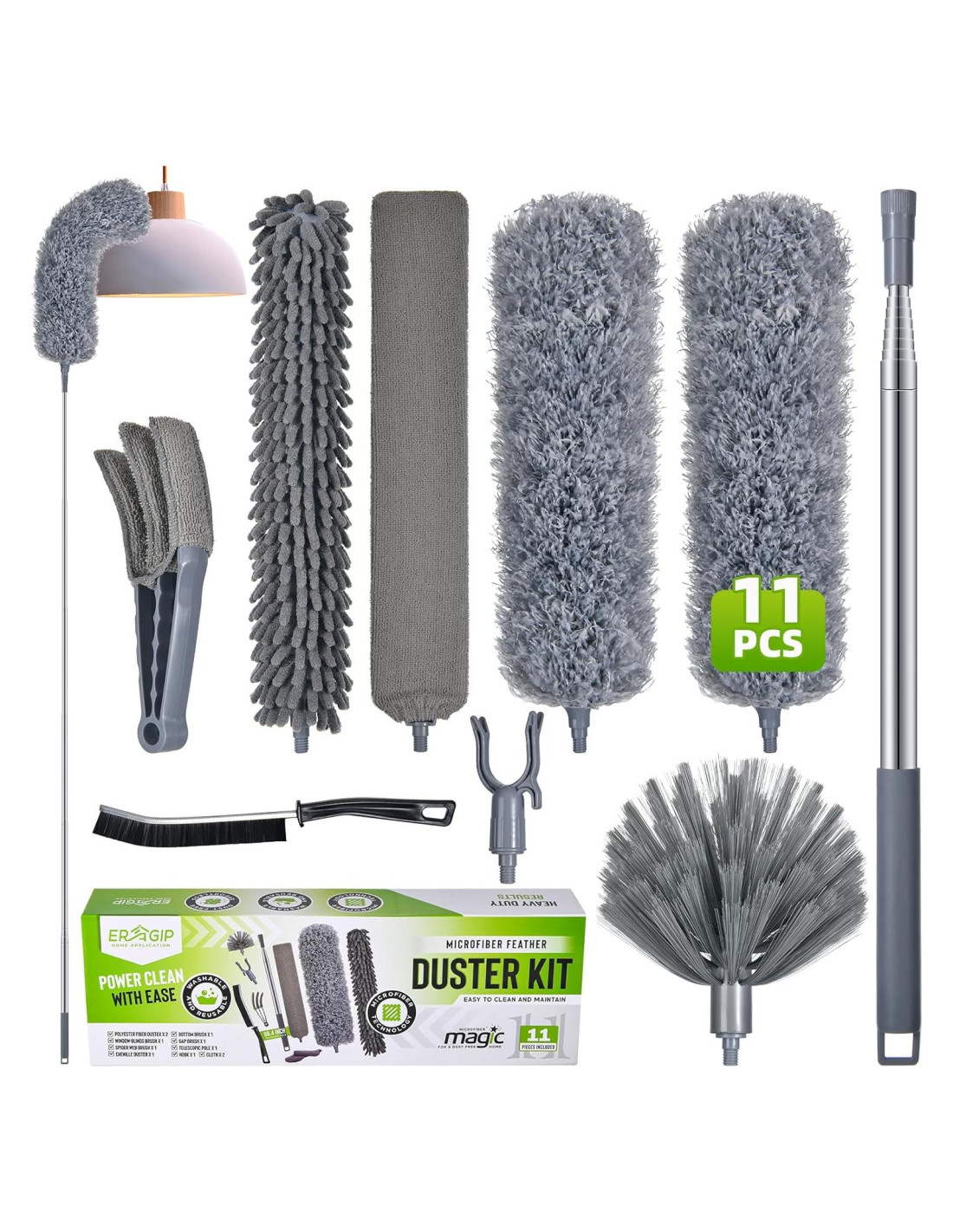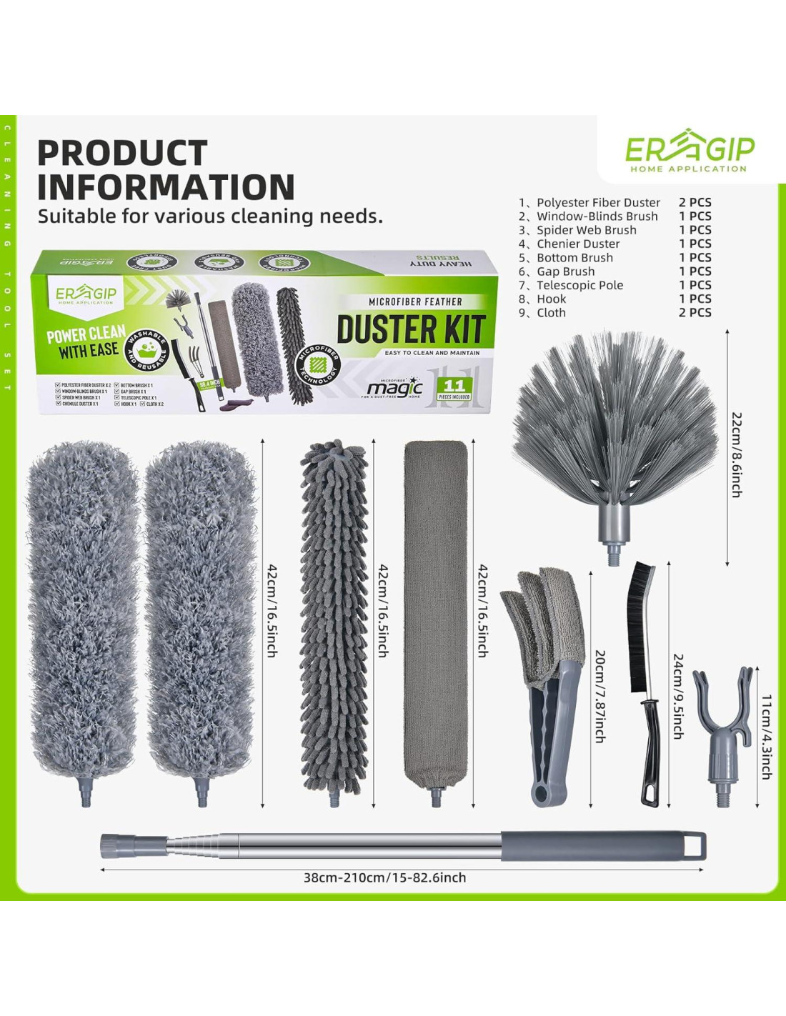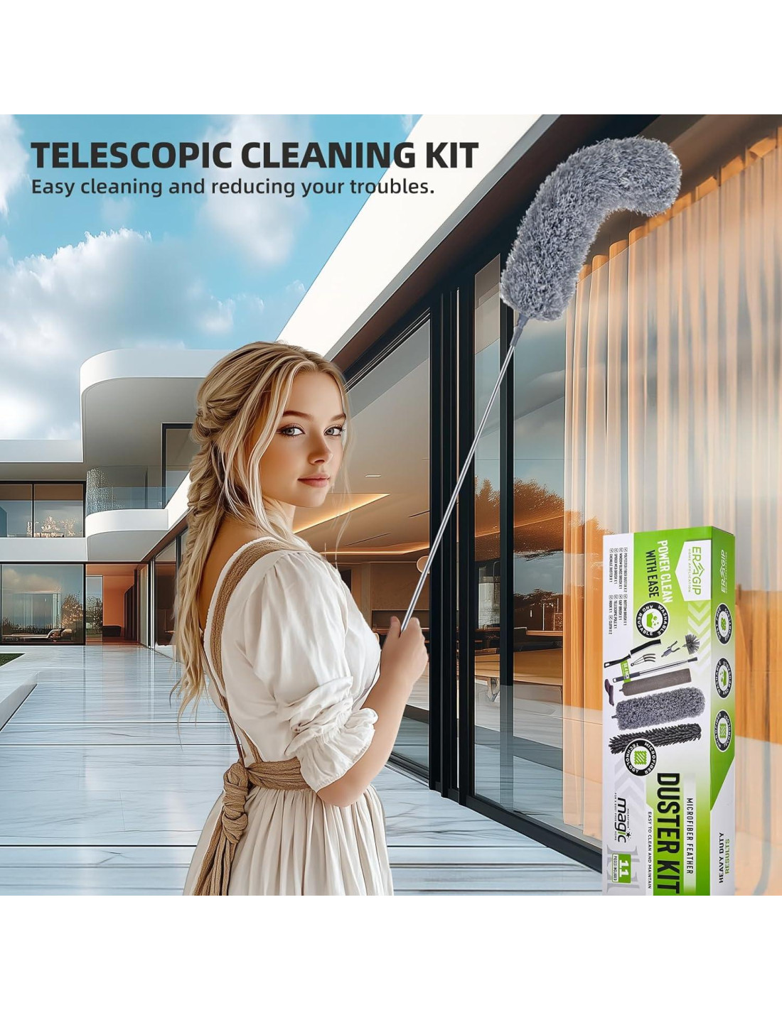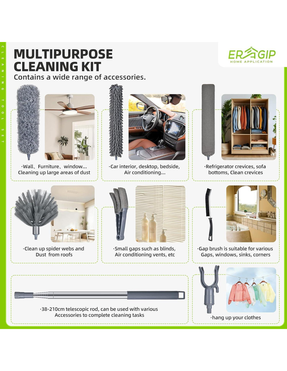 - [Kit de Limpieza de 11 Piezas para el Cuidado Total del Hogar]: Incluye 1* Polo Telescópico (hasta 100" / 254 cm), 1* Plumero de Chenille, 1* Cepillo Inferior, 2* Plumeros de Fibra de Poliéster, 1* Cepillo de Ranura, 1* Cepillo para Persianas, 1* Cepillo para Telarañas, 1* Gancho y 2* Paños de Limpieza Grises. Diseñado para limpiar su hogar desde los pisos hasta los techos, abordando ventiladores, persianas, muebles e incluso autos con facilidad.