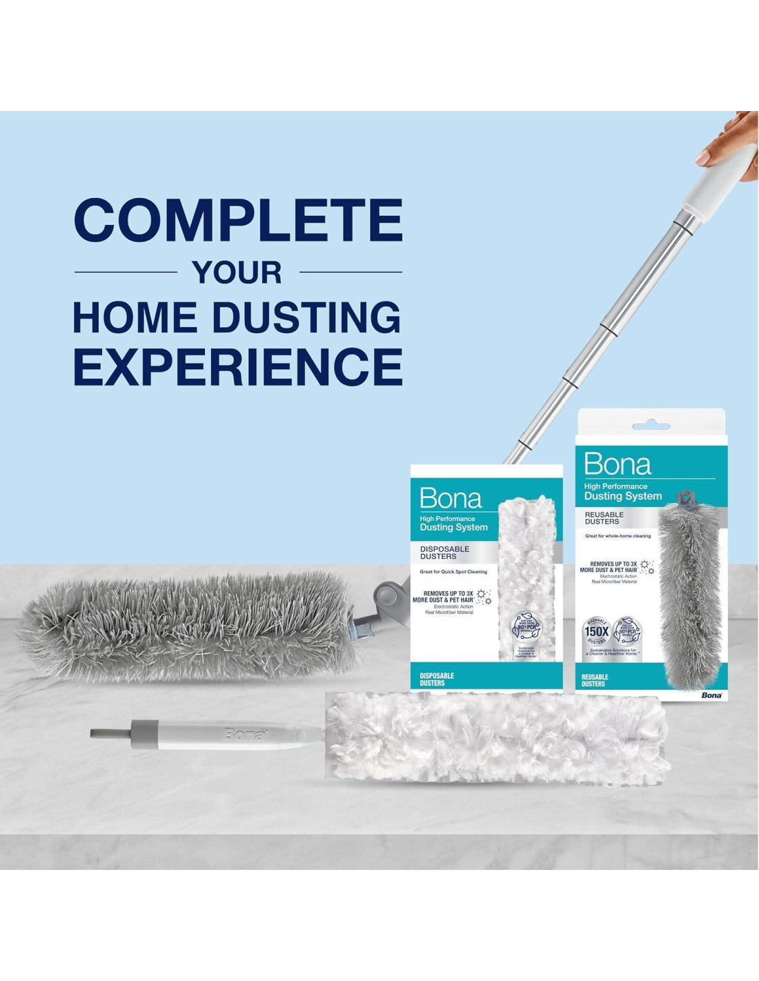 Eleva tu rutina de limpieza a un nivel completamente nuevo con el nuevo Sistema de Limpieza de Alto Rendimiento Bona. Diseñado de manera única con versatilidad y rendimiento en mente, los Plumero Bona eliminan hasta 3 veces más polvo y pelo de mascotas que un plumero tradicional. Presentamos los Plumero Reutilizables Bona diseñados exclusivamente para trabajar con el Sistema de Limpieza de Alto Rendimiento Bona. Elaborados con microfibra real que no dañará ni rayará las superficies y hechos de un 90% de materiales reciclados post-consumo. A través del uso de acción electrostática, los plumero Bona atraen y atrapan el polvo, la caspa y otros alérgenos comunes del hogar, creando un ambiente saludable para tu hogar. El Plumero Reutilizable Bona es ideal para la limpieza de todo el hogar y se puede lavar hasta 150 veces. Ama tu hogar con Bona. Soluciones sostenibles para un hogar más limpio y saludable.