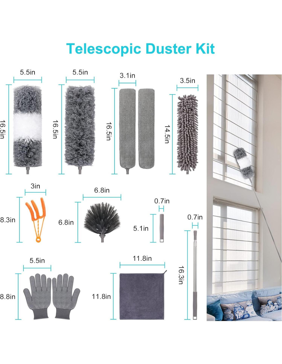- 12 PCS Kit de Plumero de Plumas: Este set de plumero de microfibra incluye 2m Polo Telescópico, 1 Cabezal de Plumero de Microfibra Flexible, 2 Cabezal de Plumero Chenille, 1 Cabezal de Plumero para Telarañas y 2 Cepillos de Hendidura, 1 plumero para persianas, 1 Paño de Limpieza de Microfibra y 2 mangos cortos de 5in (12.7 cm), Un par de guantes grises. Reemplazar diferentes tipos de cabezales de cepillo de plumero puede manejar diferentes escenarios de limpieza, manteniendo tu hogar alejado del polvo.