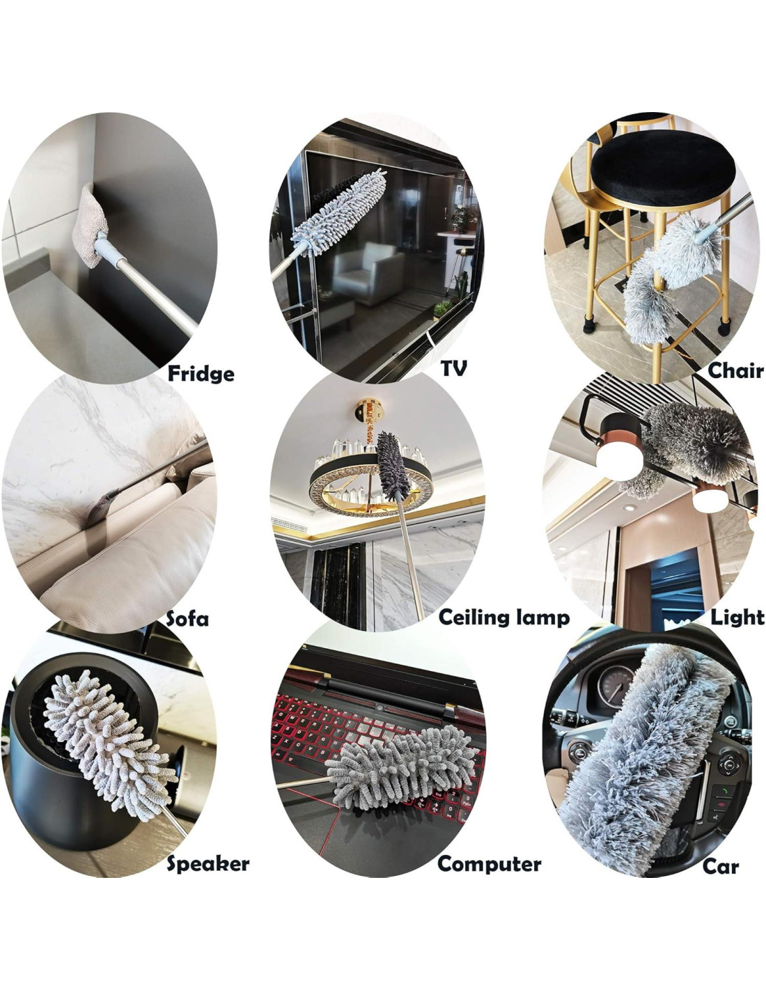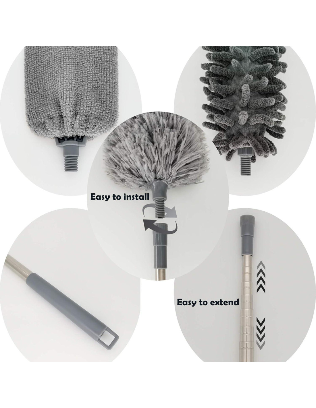 - Kit de Limpieza Profesional 5-en-1 Todo lo que necesitas: Polo de extensión telescópico (76-254 cm), plumero de microfibra flexible, cabezal de chenille esponjoso, cepillo para huecos y plumero mini. Conquista cada rincón desde techos altos hasta interiores de automóviles