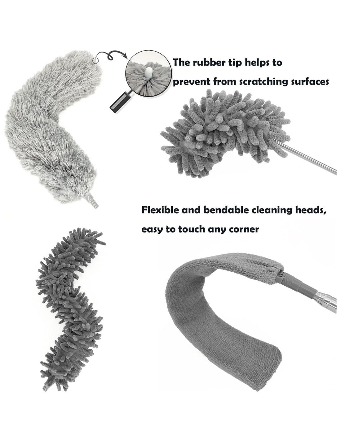 - Electrostático y Sin Rayones La microfibra genera estática para atrapar el polvo como un imán de forma permanente. Las puntas de goma suave se deslizan de forma segura, protegiendo paredes y todas las superficies de los muebles de rayones