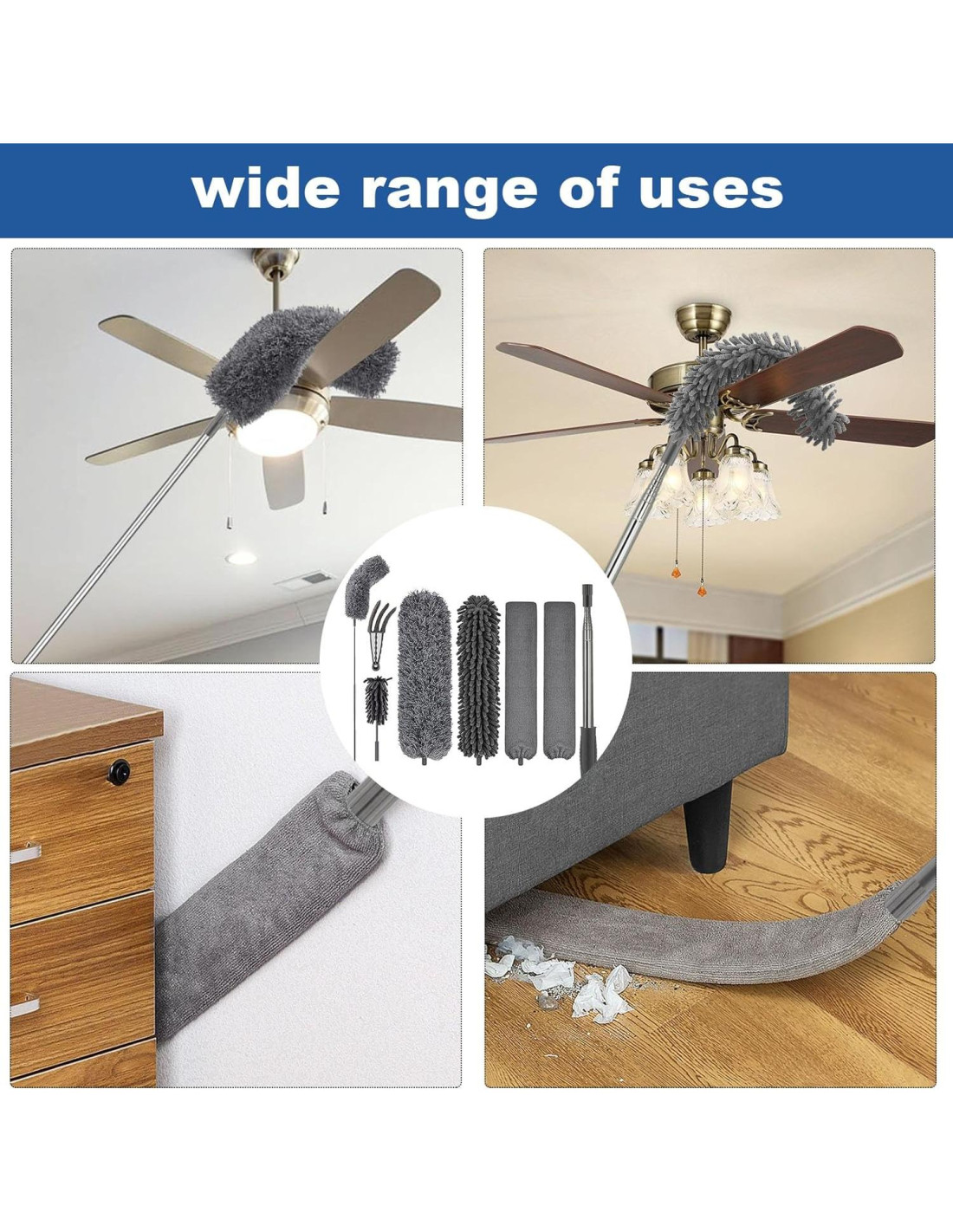 - 6 accesorios: El paquete incluye 1* Nueva varilla extensible mejorada, 1* Plumero de Microfibra, 1* Plumero de Microfibra de Chenilla, 1* Mini Plumero de Microfibra de Chenilla, 1* Cepillo de Ranura, 1* Tela del Cepillo de Ranura, 1* Plumero para Persianas. La varilla telescópica se conecta fácilmente con todos los accesorios, que manejan cada desafío de limpieza - desde ventiladores de techo hasta persianas, espacios estrechos hasta superficies delicadas.
