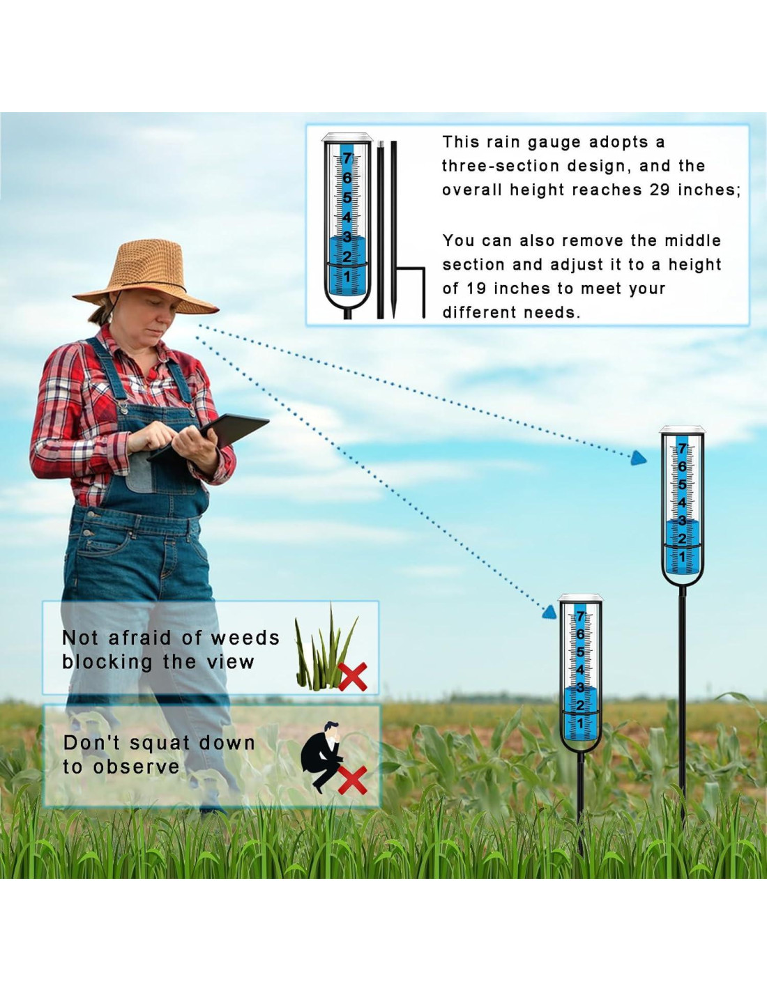 - [Altura ajustable] Este medidor de lluvia para el jardín está diseñado como una estructura de tres secciones, la altura total alcanza 73.66 cm (29 pulgadas). Puedes quitar la sección del medio y ajustarlo a una altura de 48.26 cm (19 pulgadas) si lo necesitas. La altura de 73.66 cm (29 pulgadas) es más alta que otros pluviómetros de vidrio en el mercado, no es fácil de cubrir por flores o hierba, fácil de leer.