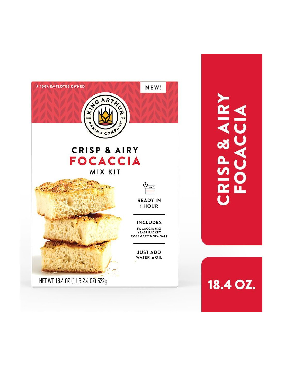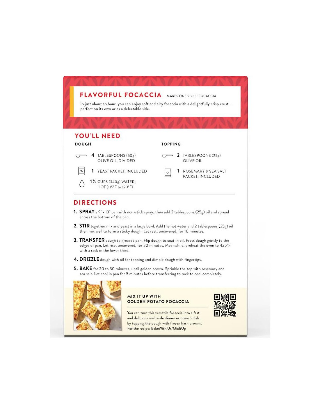 - Este kit de mezcla de 18.4 oz hace una bandeja de 9" x 13" de focaccia crujiente y ligera. Nuestras mezclas están cuidadosamente elaboradas en nuestra cocina de pruebas a través de meticulosas pruebas de sabor; es un trabajo difícil, pero estamos a la altura del desafío.
