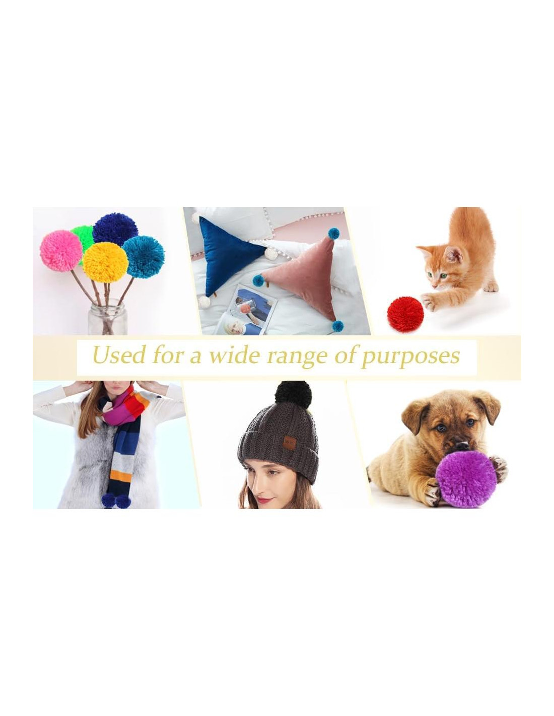 - Asortimento de Colores: Recibirás pompones de hilo que incluyen estos 8 colores: blanco, negro, amarillo, naranja, púrpura, amarillo, beige, gris, burdeos, rosa fuerte, rosa claro, rosa concha y verde menta.