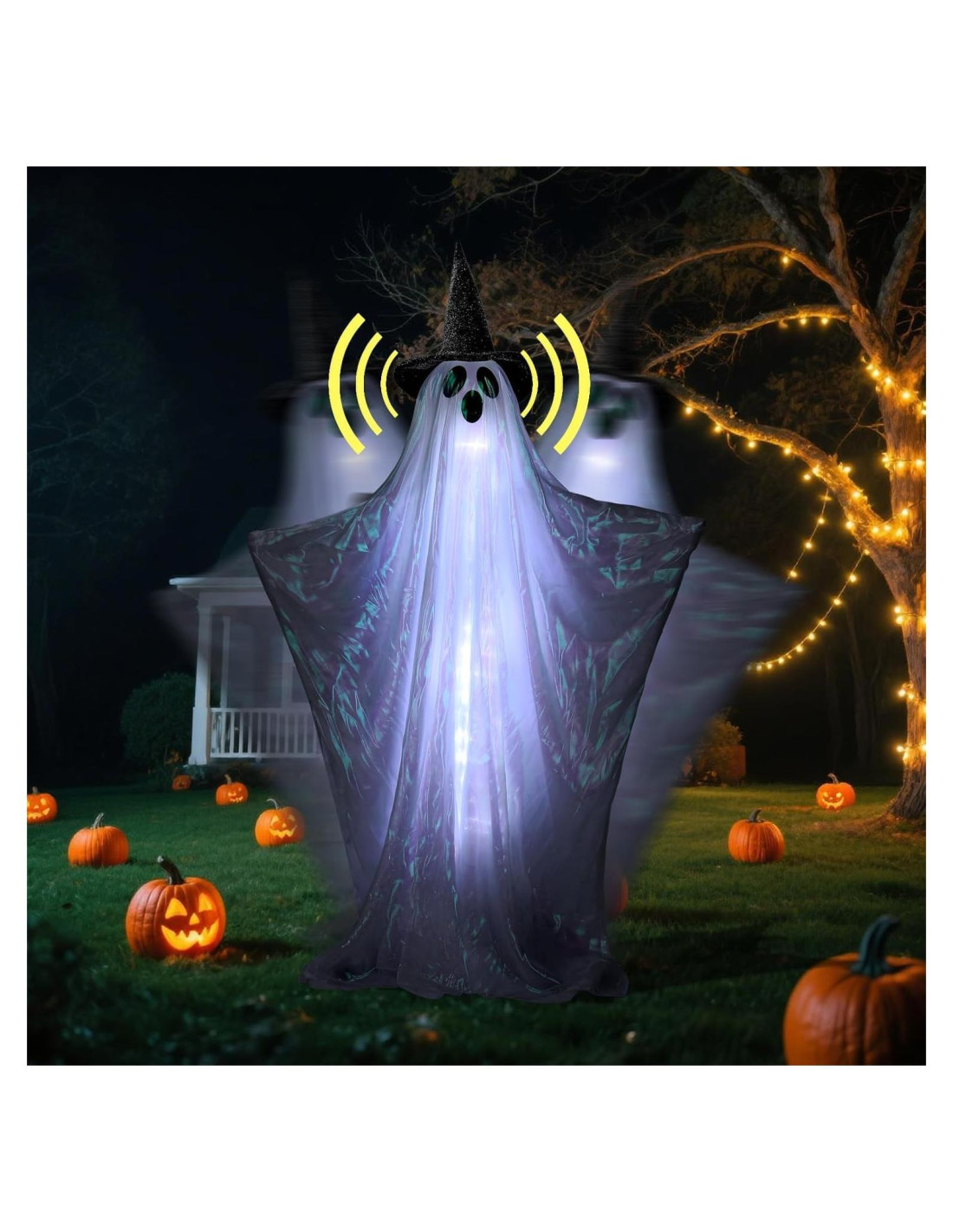 - [ Fantasma de Tamaño Real de 64 Pulgadas para Impacto de Halloween ] - Haz una declaración escalofriante este Halloween con nuestro fantasma animado de 64 pulgadas. Vestido con un sombrero de bruja espeluznante y tela iridiscente que fluye, es el centro perfecto para tu decoración exterior.