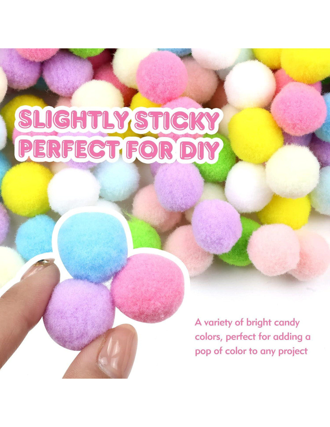 - [Pompones de 2 CM/0.8 Pulgadas]: El diámetro de una bola es 2cm/0.8 Pulgadas, fácil de sostener y jugar, el tamaño adecuado para satisfacer la mayoría de las necesidades de manualidades. La edad recomendada es de 3 años o más para evitar posibles riesgos de asfixia.