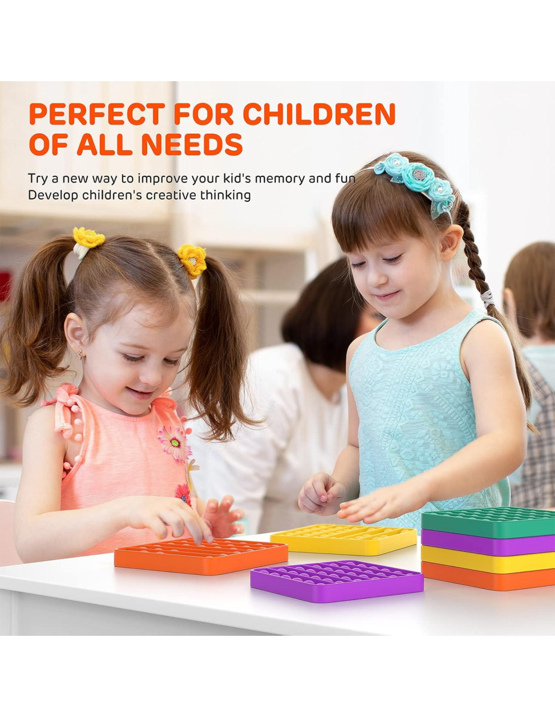 - [Juegos para Todas las Edades] Estos juguetes antiestrés son geniales para todos. Para los niños, los juguetes antiestrés son perfectos para que los amigos pasen un tiempo feliz juntos. Para los adultos, alivia el estrés y mantiene el cerebro activo, previene la degeneración. Es un buen ayudante para aliviar la ansiedad. Al apretar nuestra burbuja de silicona, puedes obtener consuelo mental y liberación emocional.