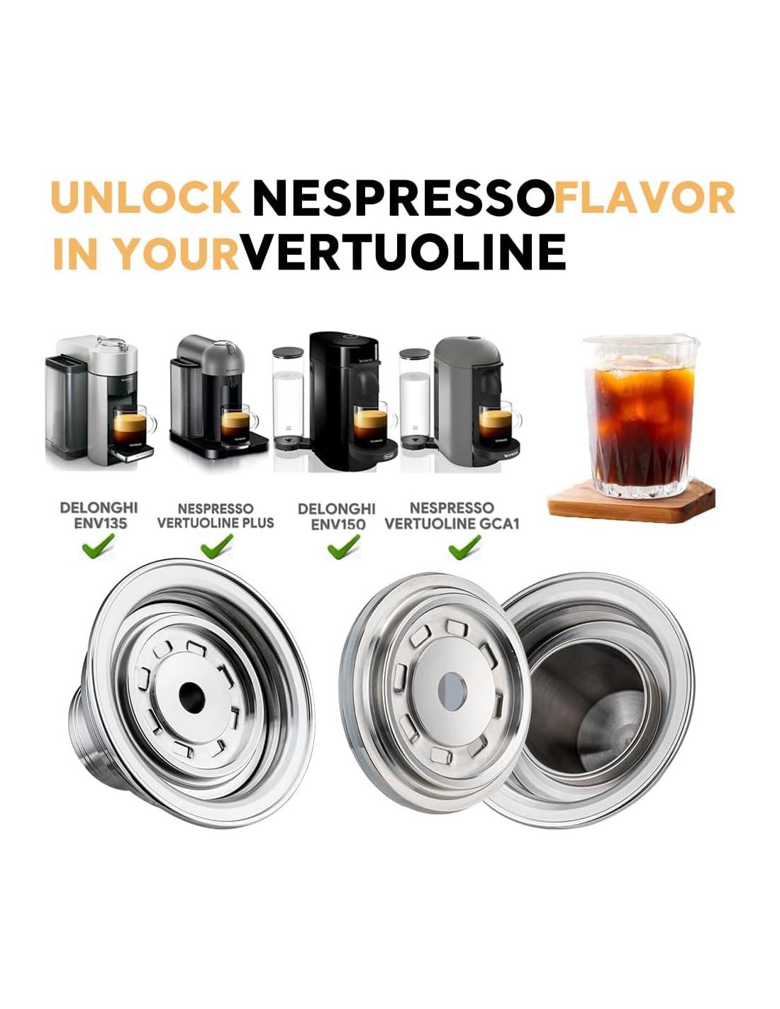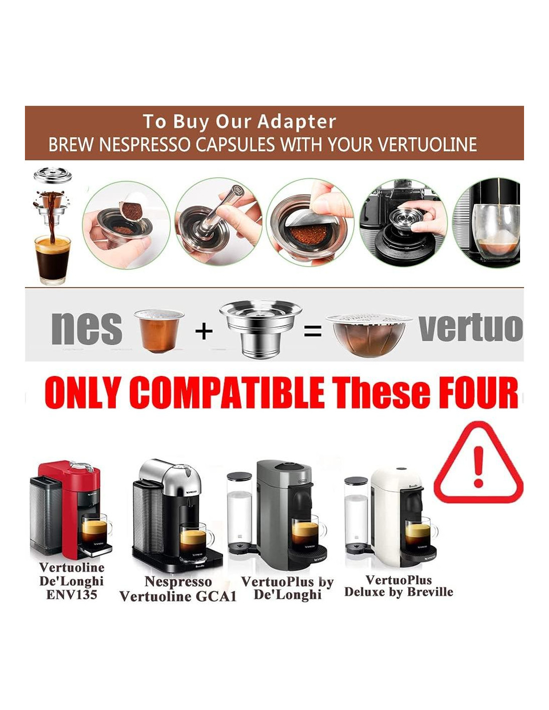 Atención: Este adaptador es solo para proporcionar a su máquina veruoline la capacidad de preparar cápsulas de café original de nespressp, debe usarse con cápsulas desechables de cápsulas originales de espresso. Y el producto solo es compatible con los siguientes CUATRO modelos (ya que solo hemos probado en estos cuatro modelos). Por favor, tenga en cuenta: La máquina de café necesita ser cuidada, por lo tanto, verifique su modelo antes de comprar. Nuestro adaptador solo es compatible con estos cuatro modelos: ver-tuoline GCA1, Delonghi ENV135 y ENV150, Ver-tuoline Plus. Si lo compra para otras máquinas, tenga mucho cuidado al probar para evitar daños a sus máquinas (los costos no están cubiertos). Animamos a probar en otras máquinas y garantizamos un reembolso parcial, pero esperamos que nos informe al enfrentar errores o algo, solucionaremos cualquier caso juntos, gracias de antemano. Consejos de preparación: se trata de 2 onzas (56.7 gramos) de cantidad de preparación (las cápsulas de Nes*presso de la línea original solo preparan 1.3 onzas (36.8 gramos), ya que está diseñado y depende de la máquina misma, por favor, tómelo en cuenta. Si se requieren 4-8 onzas (113.4-226.8 gramos), dos adaptadores son más convenientes de usar.