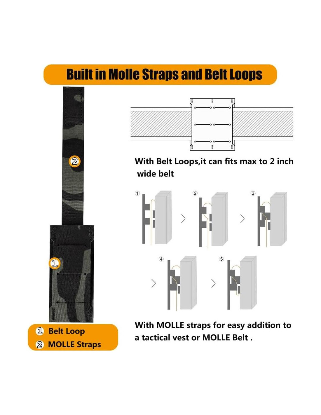 - Multi-Función: Esta Funda de Cargador se puede montar en un cinturón de servicio, cinturón de tiradores o en equipos de sistemas MOLLE. Con lazos para cinturón, se adapta a un cinturón de hasta 2 pulgadas (5,08 cm) de ancho, y con correas MOLLE para fácil adición a un chaleco táctico o cinturón MOLLE.