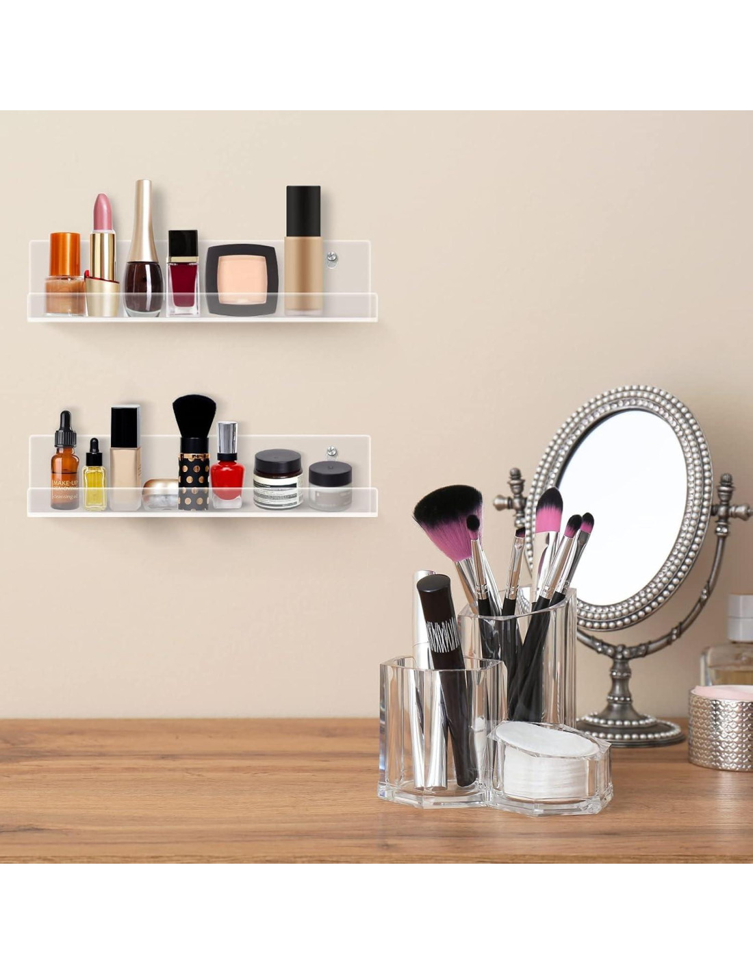 - Multifuncional: Los estantes flotantes son modernos y elegantes, el diseño transparente puede mostrar mejor lo que deseas, como marcos de fotos, libros, discos de vinilo, perfumes, coleccionables, figuras, etc. Decoración para el hogar.