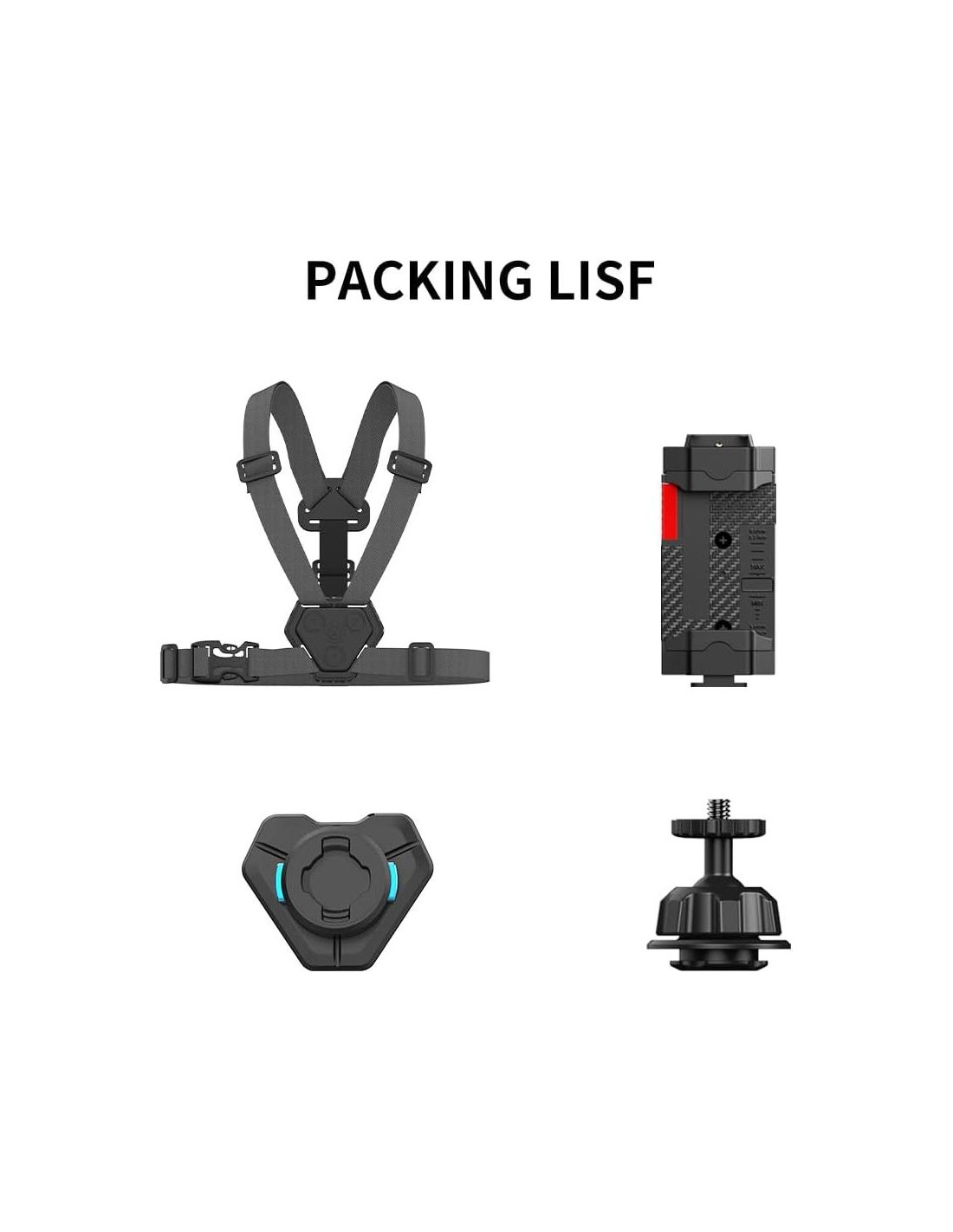 - Interruptor de grabación horizontal y vertical: presione los botones azules a ambos lados del soporte de pecho al mismo tiempo para desbloquearlo y cambiar entre grabación horizontal y vertical en un segundo para imágenes de grabación más diversas