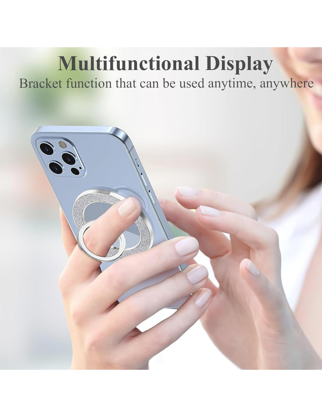 - Diseño Elegante y Ajustable - Nuestro agarre para teléfono MagSafe cuenta con un diseño de rotación de tres ejes, lo que te permite ajustar el ángulo de tu teléfono a tu gusto. Además, su diseño elegante y brillante añade un toque de glamour a tu teléfono.