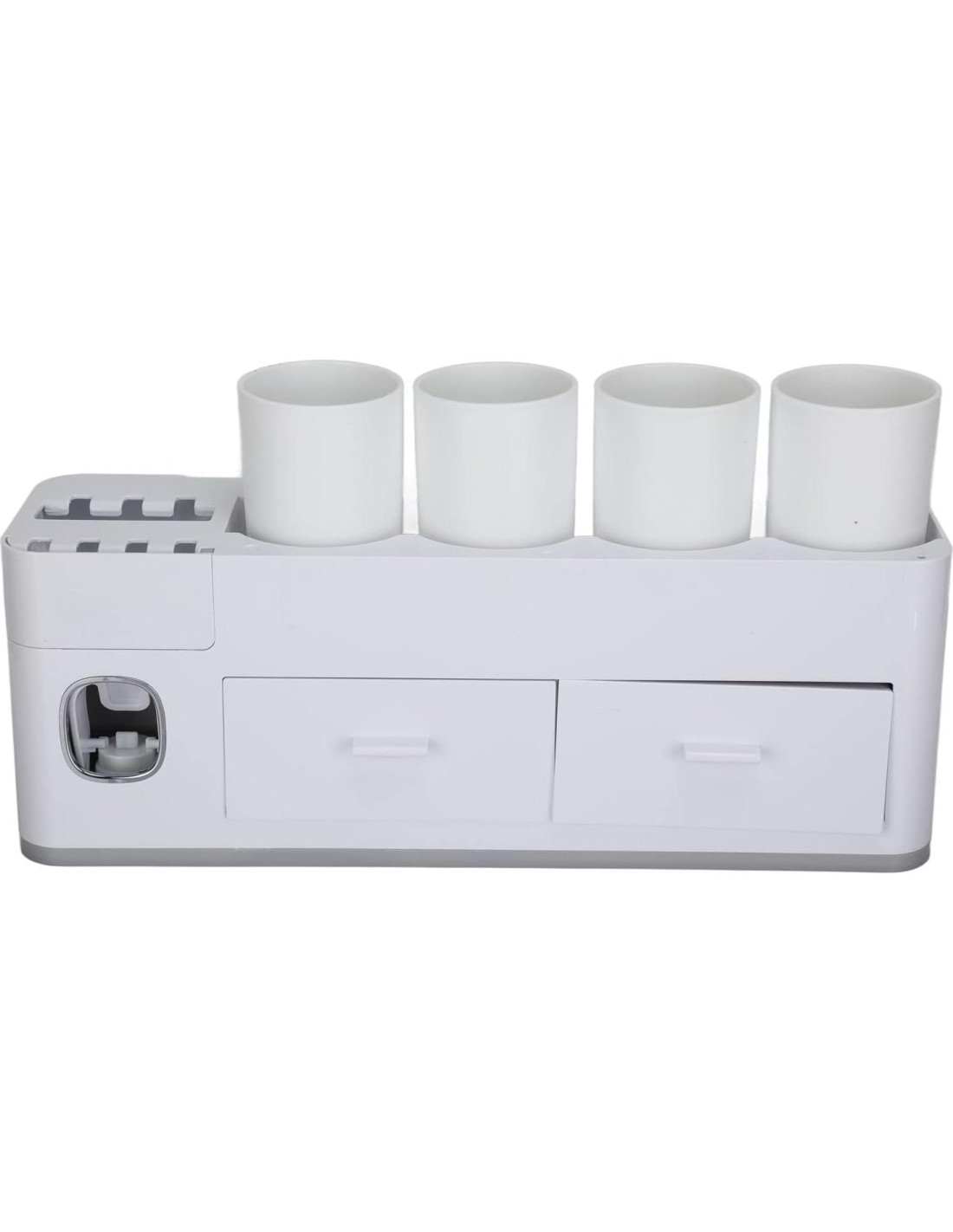 - AHORRO DE ESPACIO: Este estante de almacenamiento de artículos de tocador colgante para baño es multifuncional y ahorra espacio. Kit de dispensador automático de pasta de dientes con taza de enjuague bucal magnética y ranura para cepillo de dientes.